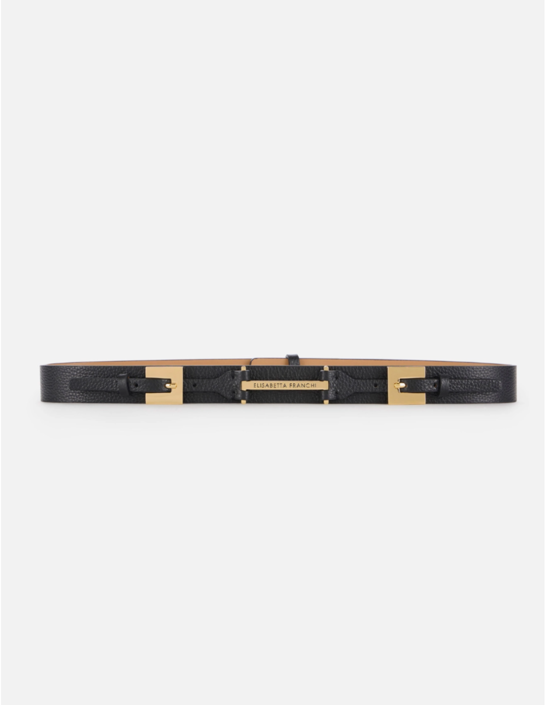 Cette ceinture taille haute en cuir de la maison Elisabetta Franchi se distingue par son design raffiné et sa double boucle métallique dorée rehaussée d’une plaque signature élégante. Le réglage coulissant au dos permet un ajustement parfait, tandis que la largeur étudiée valorise la silhouette tout en apportant une touche d’allure sophistiquée à vos tenues.