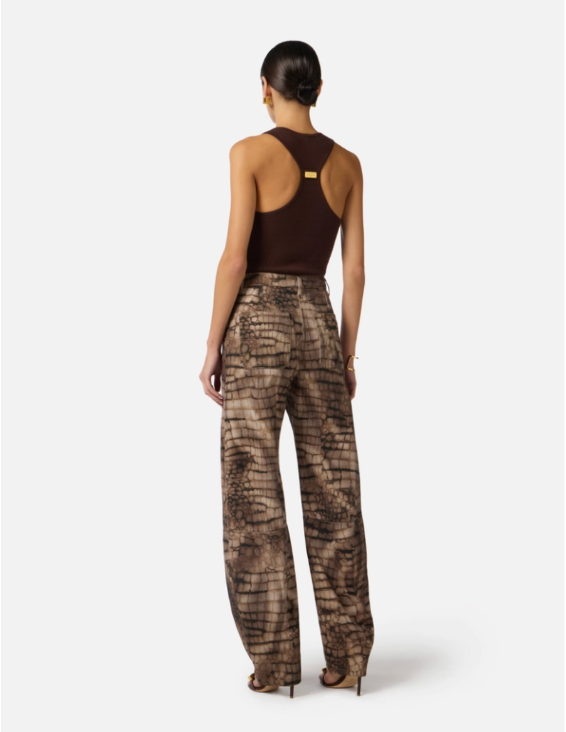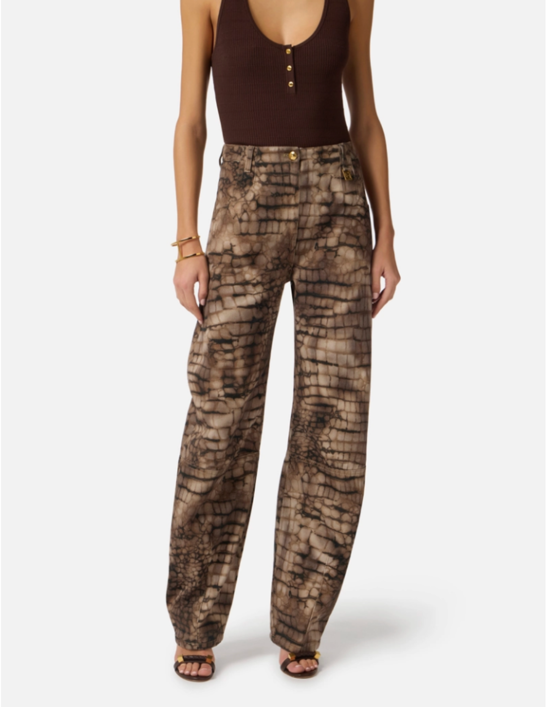 These drill jeans with alligator print by Elisabetta Franchi stand out for their original design and modern appeal. The alligator print adds a bold and sophisticated touch, while the elegant cut enhances the silhouette with style. Crafted from premium drill fabric, they ensure comfort, structure and a refined look.