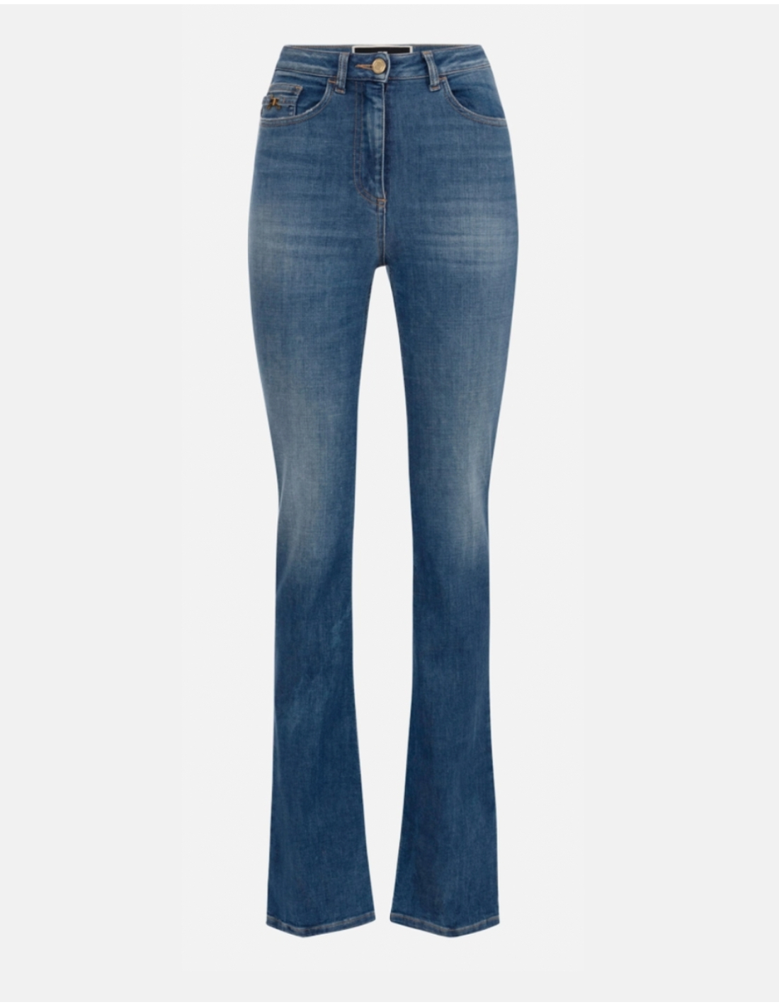 Le jean Palazzo signé Elisabetta Franchi se distingue par sa coupe près du corps sur le haut et son évasement élégant sur le bas. Conçu en denim stretch de haute qualité, il épouse la silhouette tout en offrant confort et fluidité. Le détail du patch logo en métal doré sur la poche arrière ajoute une touche raffinée et immédiatement reconnaissable de la maison italienne. Une pièce incontournable pour un look chic et contemporain.