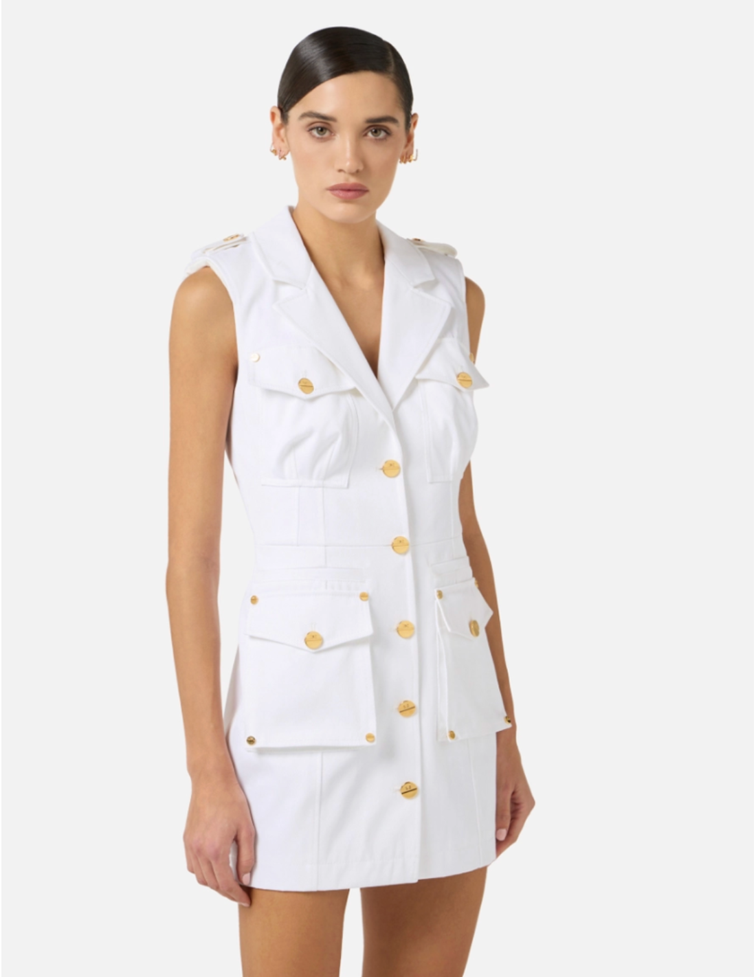 This cotton gabardine dress features structured shoulders and flap pockets that combine function and style. The gold metal logo buttons add a refined touch that elevates the overall design.