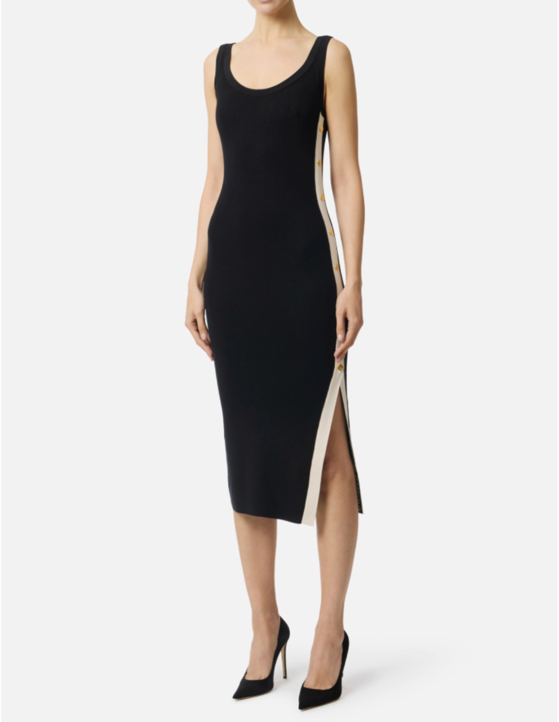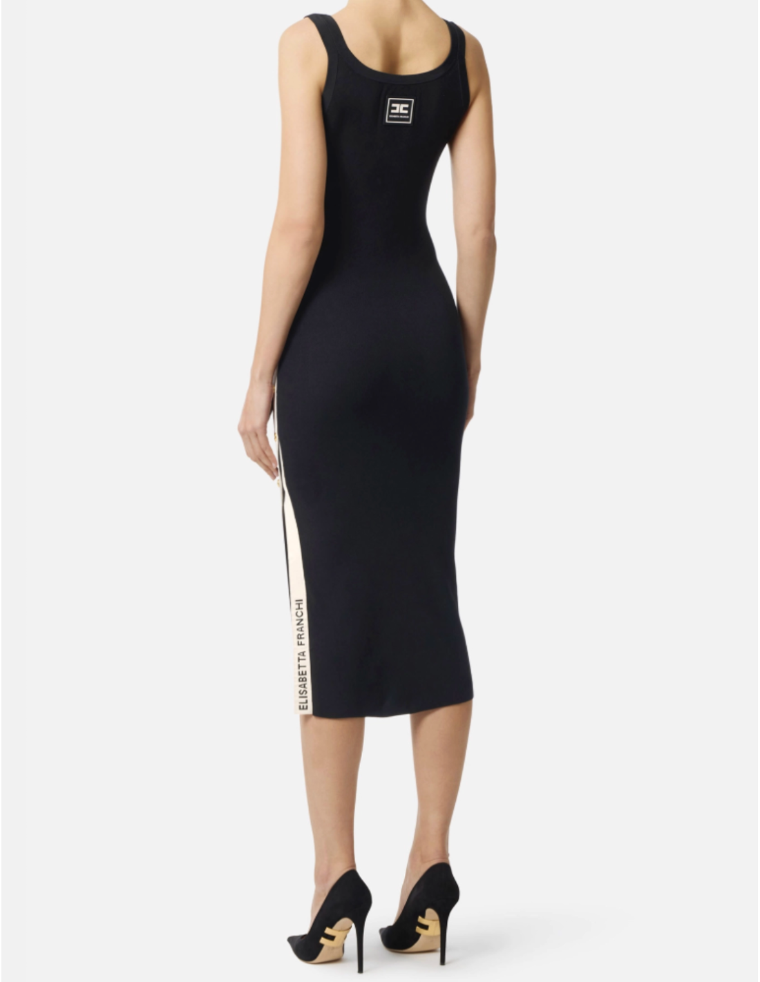 This knit dress with shiny viscose bands by Elisabetta Franchi captivates with its slim fit and striking graphic design. Sleeveless with a tank-style neckline, it offers a refined silhouette that transitions beautifully from day to night.