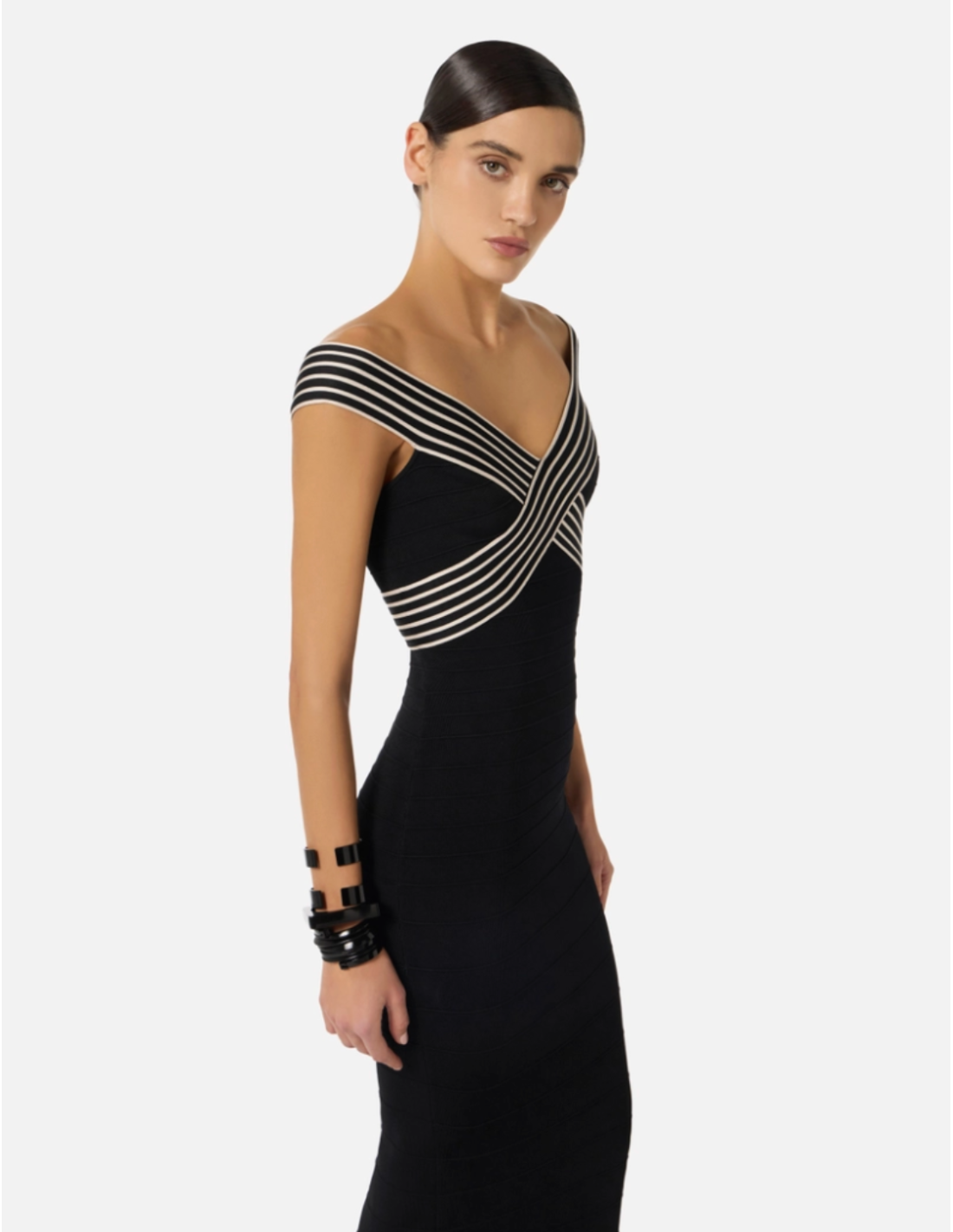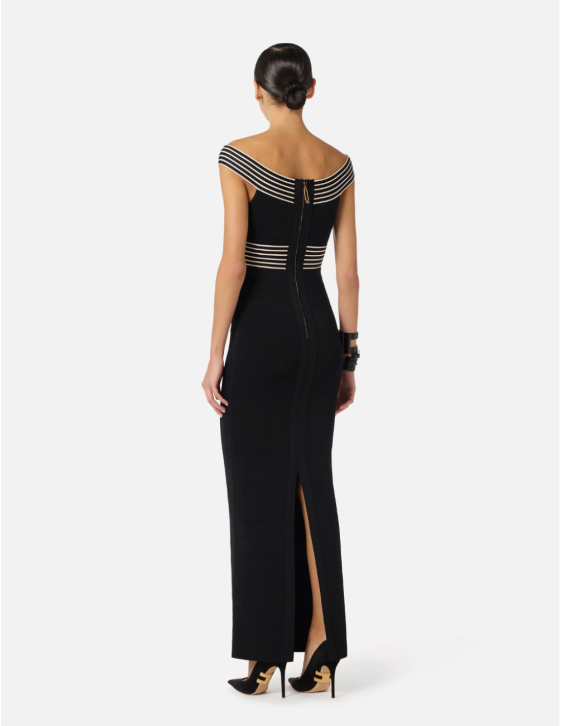 This long knit dress with striped bands by Elisabetta Franchi offers a modern yet comfortable style. Its flowing silhouette enhances the figure while maintaining a relaxed chic look, perfect for both casual and refined occasions.