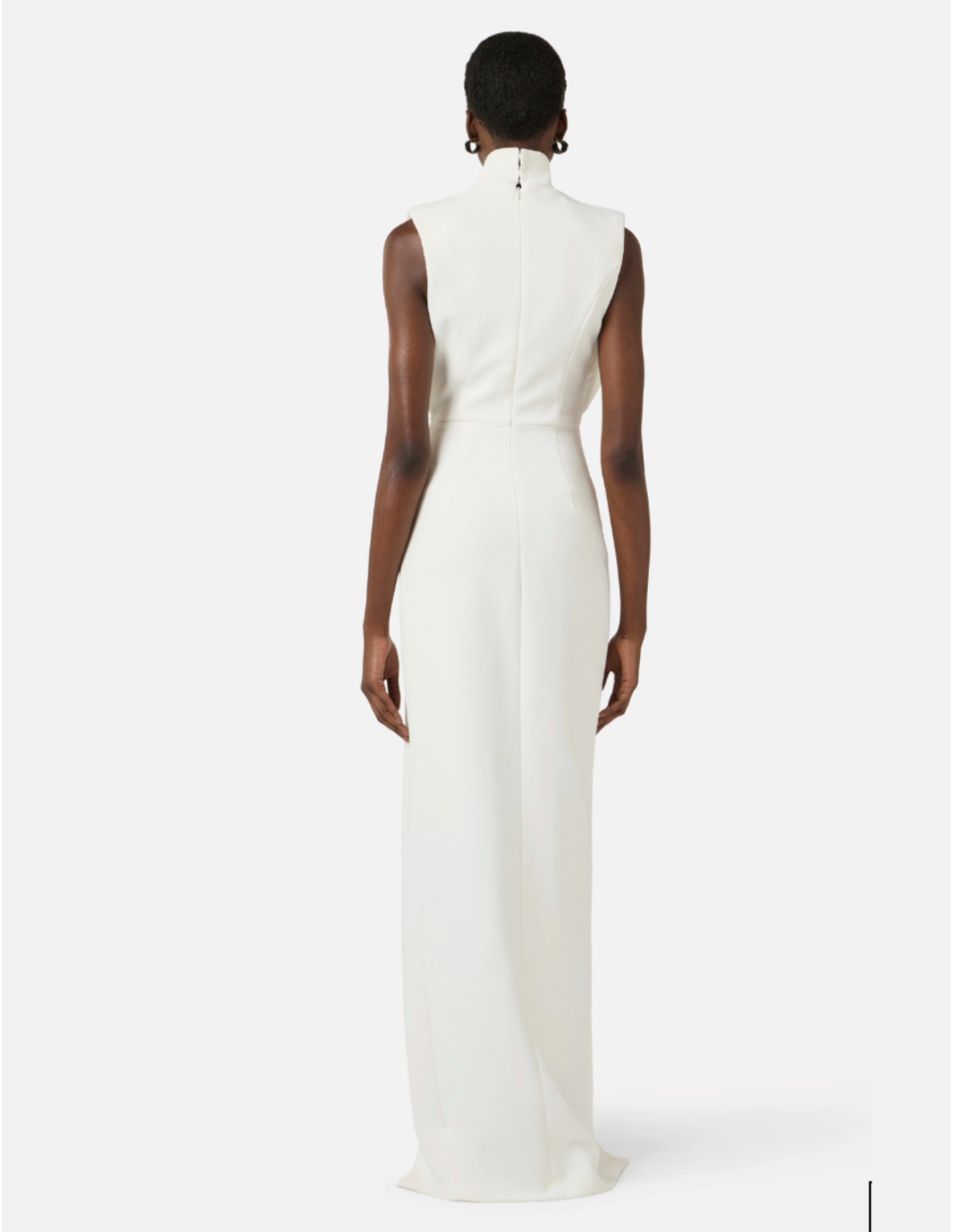 This Red Carpet dress in lightweight crepe with satin lapels blends fluidity and subtle sheen for a chic, sophisticated look. The contrast between the soft crepe and the satin lapel creates refinement and modern elegance perfect for special evenings.
