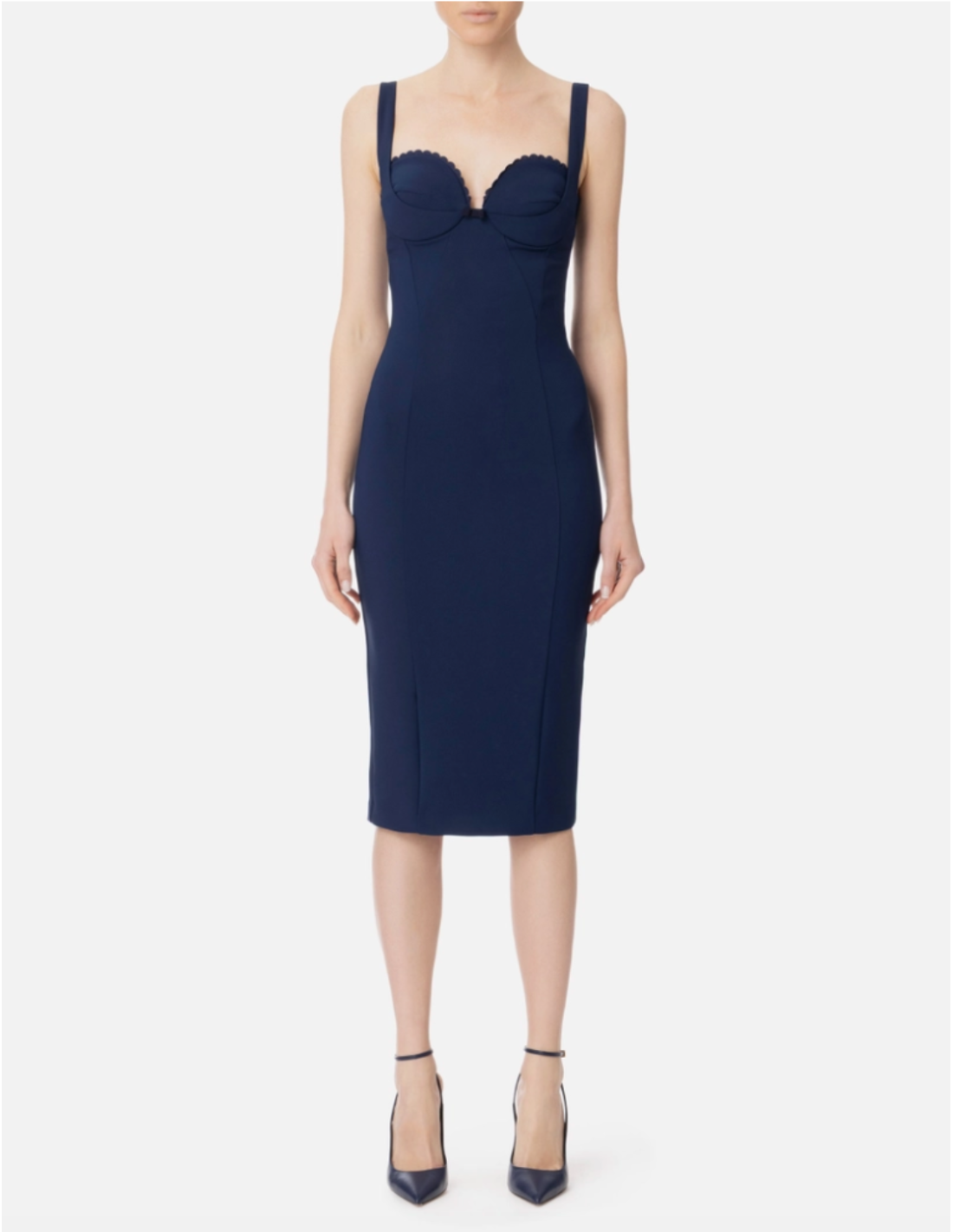 Cette robe fourreau Elisabetta Franchi en double crêpe stretch offre une coupe cintrée qui sublime la silhouette. Les coutures linéaires sur le devant et à l’arrière structurent la tenue, tandis que le feston brodé sur les bonnets apporte une touche raffinée. Les bretelles réglables et la doublure en satin assurent confort et maintien. Une pièce élégante et sophistiquée, idéale pour les occasions où l’on souhaite allier style et féminité.