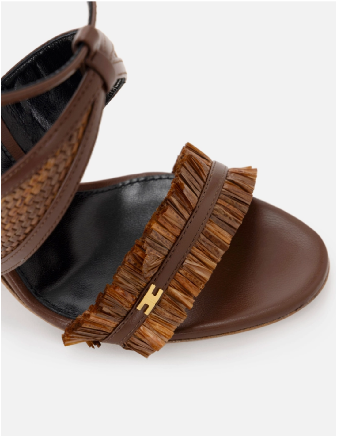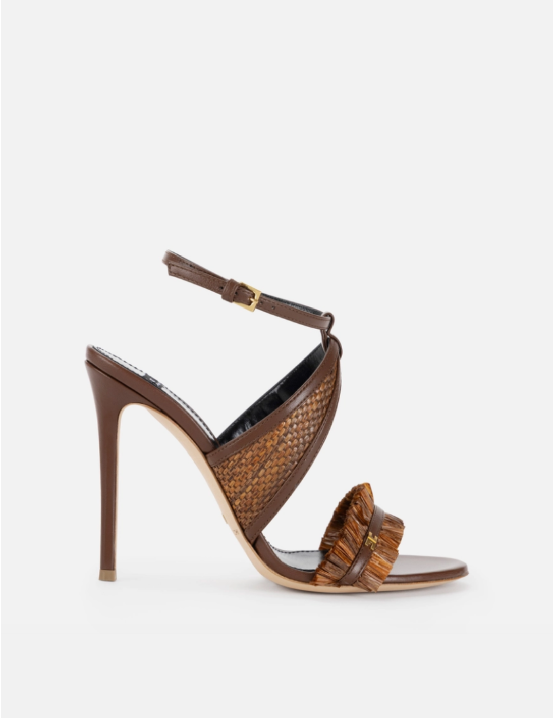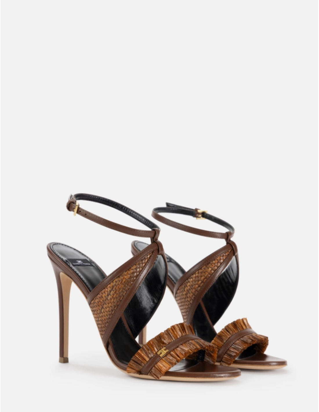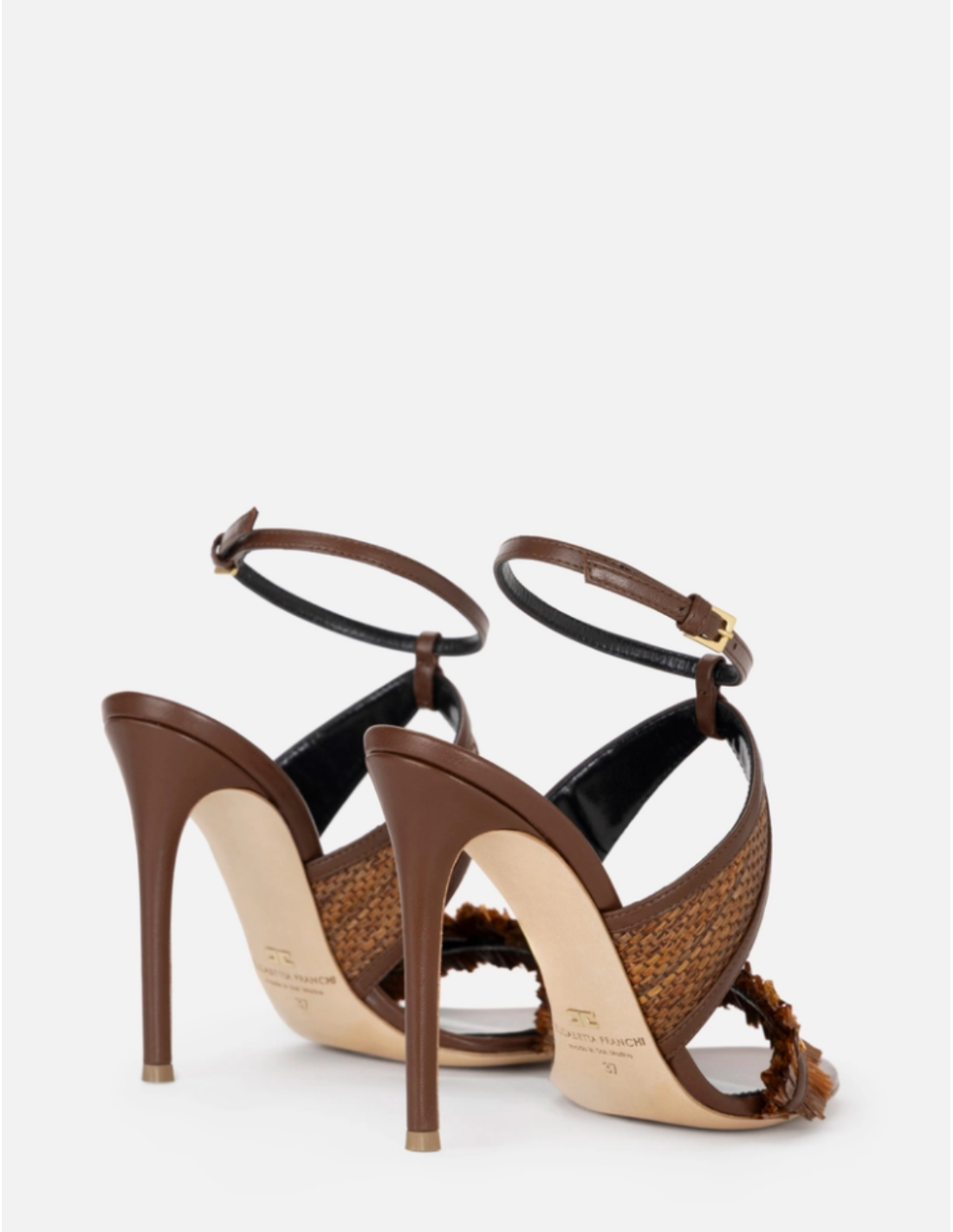Sandales Beach Club Elisabetta Franchi en cuir nappa avec inserts en raphia, offrant un mélange raffiné de texture et de confort. Les profils effrangés et le détail logo apportent une touche élégante et distinctive à votre tenue.