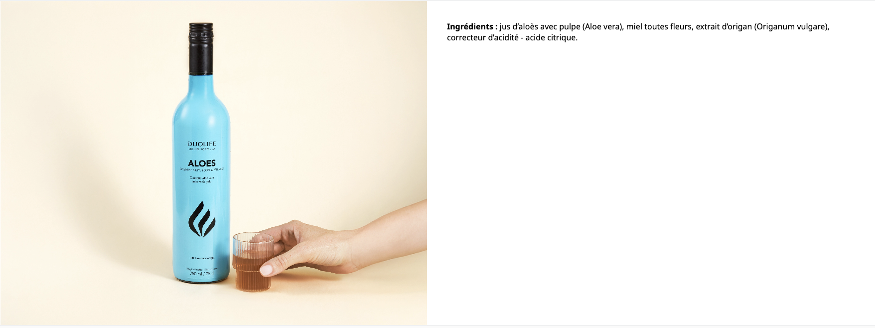 Fidèle à sa philosophie du bien-être naturel, DuoLife conçoit ses compléments sans compromis sur la qualité. DUOLIFE Aloes est formulé sans conservateur, sans OGM et sans gluten, pour préserver la pureté de votre organisme et de la planète. Les emballages sont sûrs et respectueux de l’environnement, garantissant un produit sain et authentique.