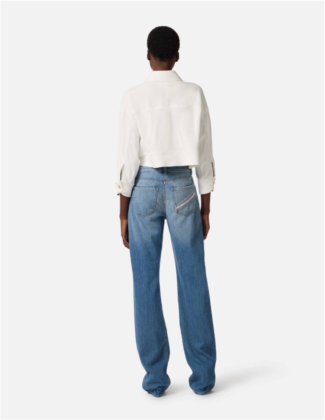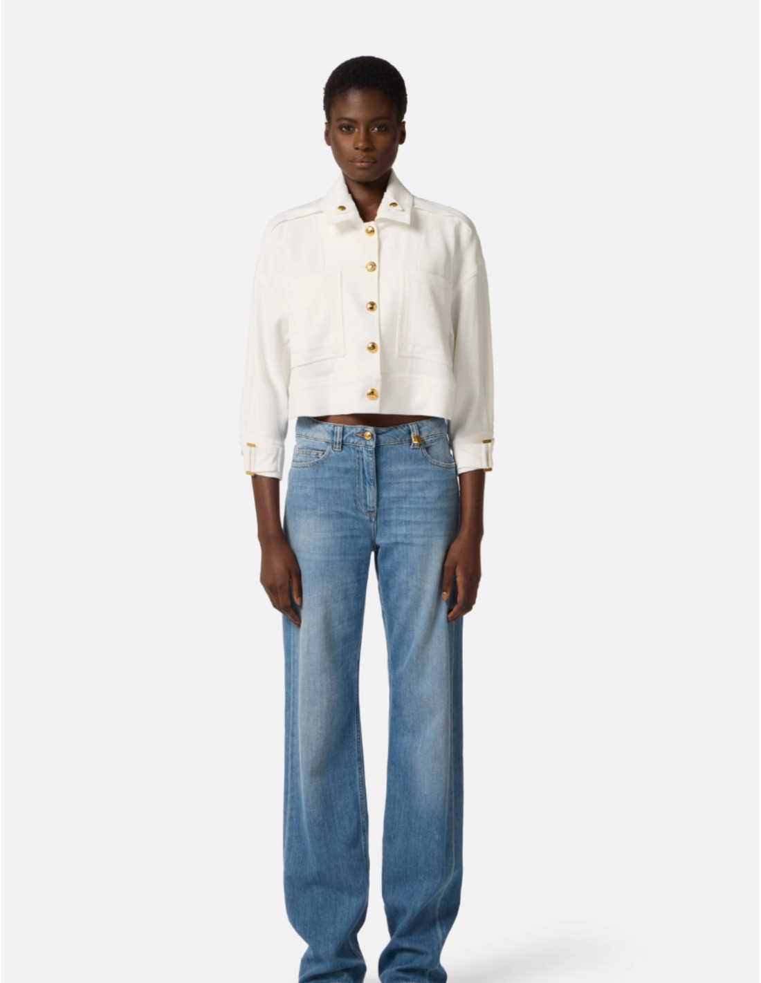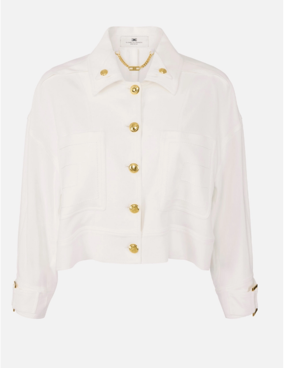 This gabardine pea coat by Elisabetta Franchi features a contemporary oversized fit, combining comfort and sophistication. It is designed with a double collar, ¾ length sleeves with frog closures, and bright golden metal buttons that bring a luxurious touch to the garment. :contentReference[oaicite:3]{index=3}