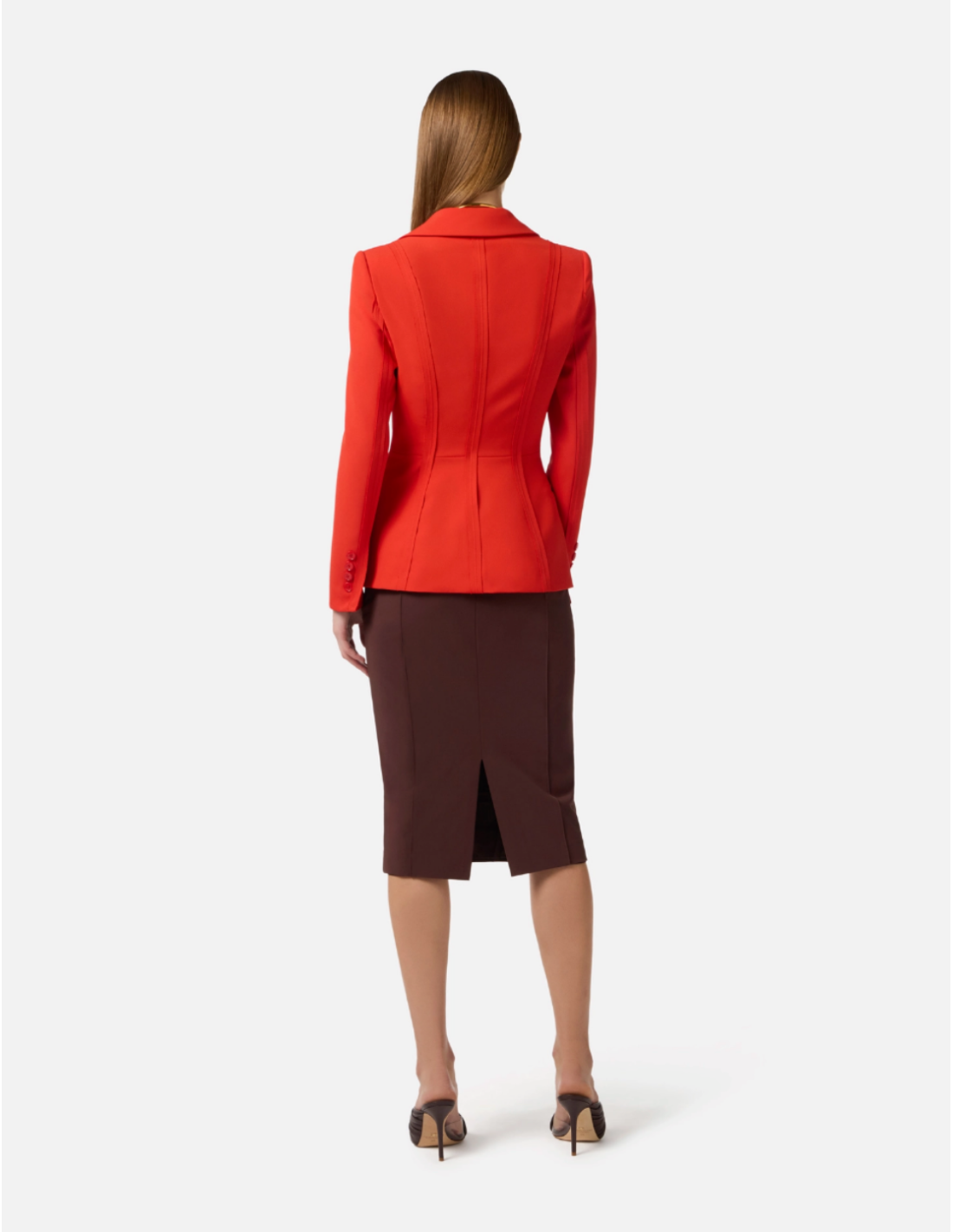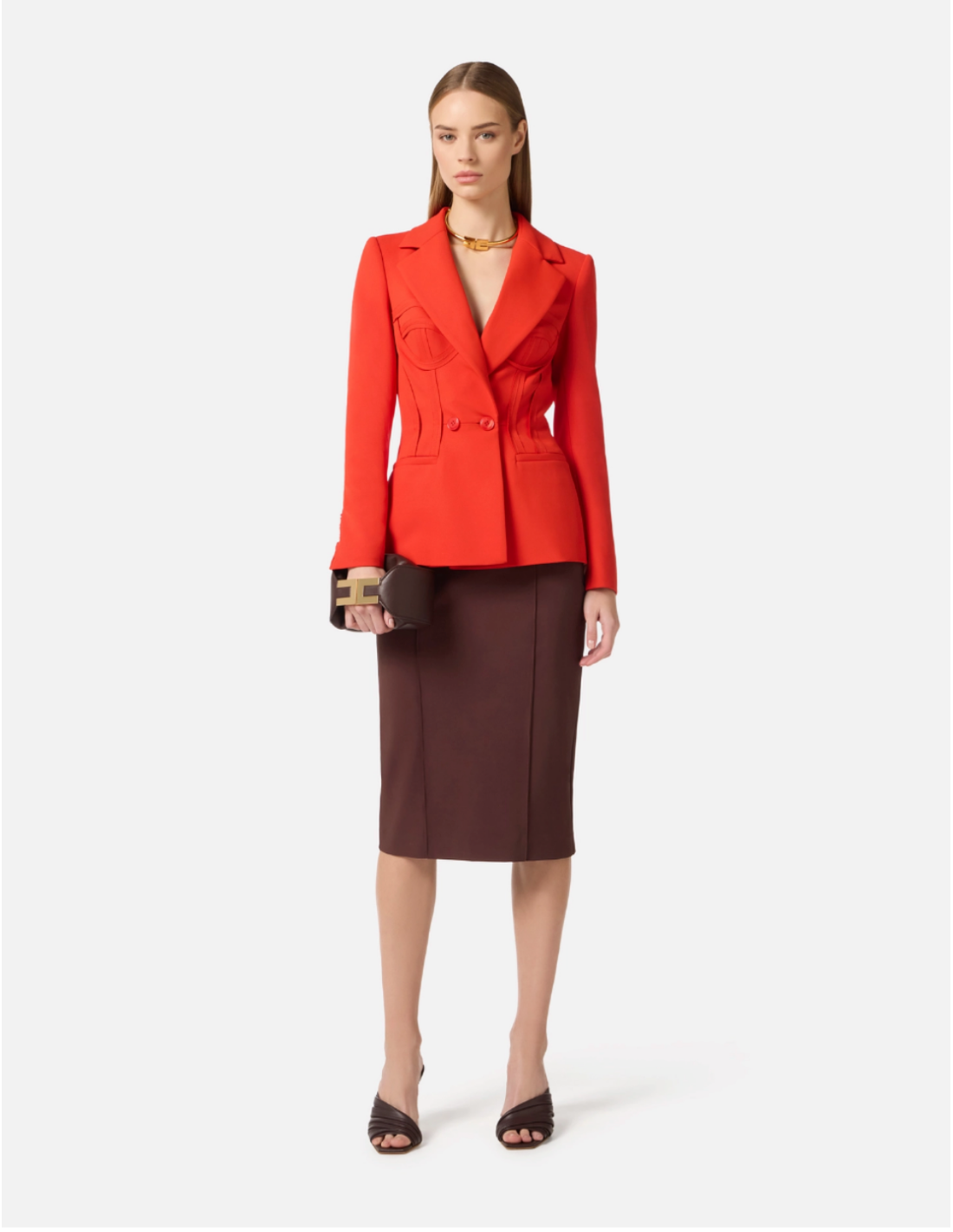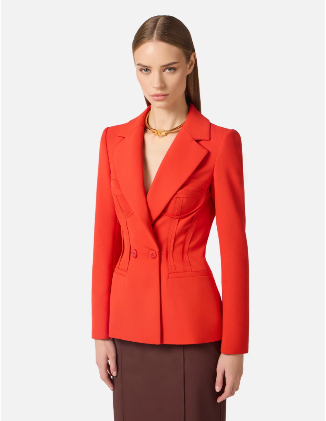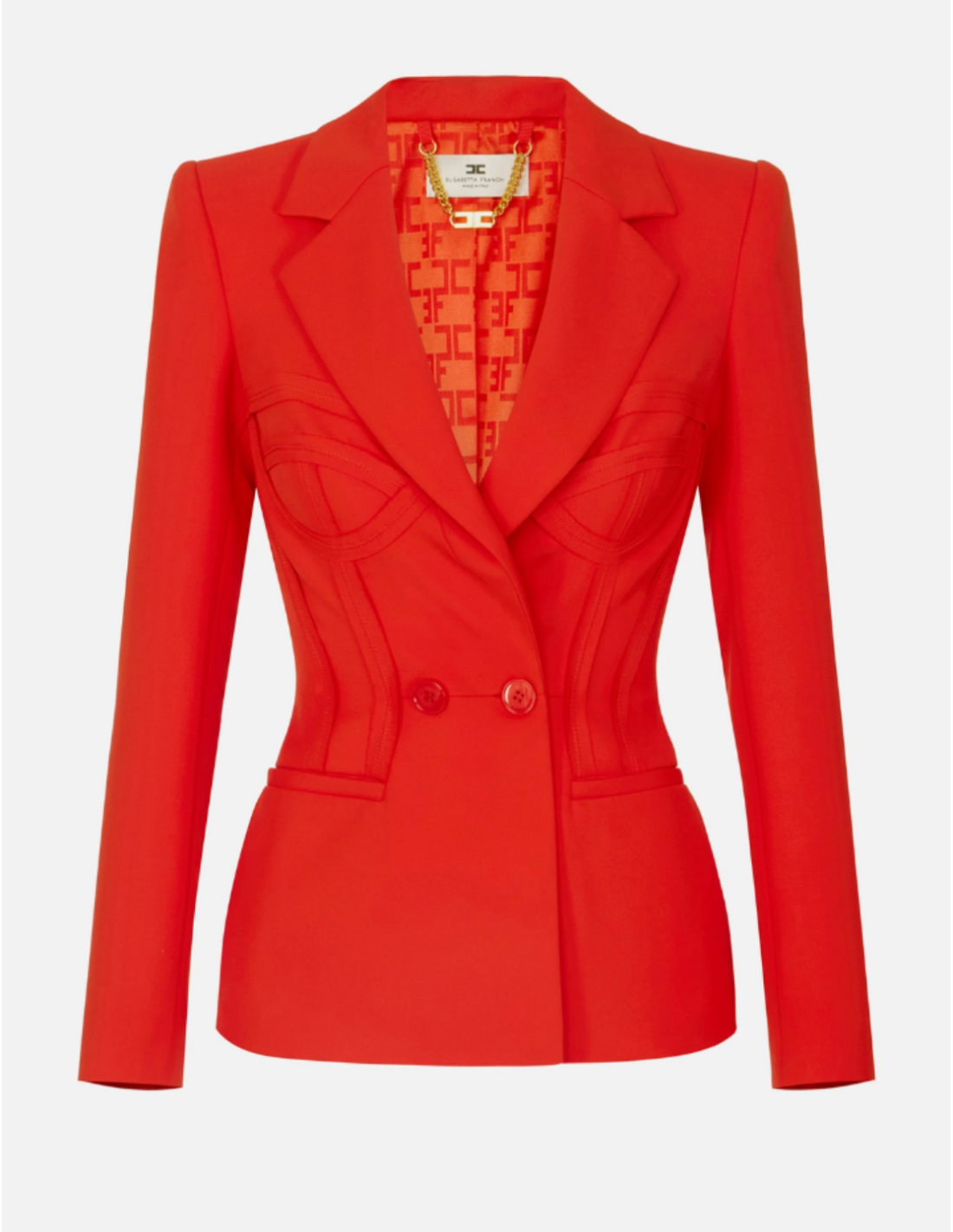 This lightweight crêpe jacket from Elisabetta Franchi offers a refined, modern look. The blazer features structured shoulders, classic lapels and welts. It stands out with visible stitching that shapes a bustier silhouette, finished with raw‑edge fabric for a subtle 3D effect.