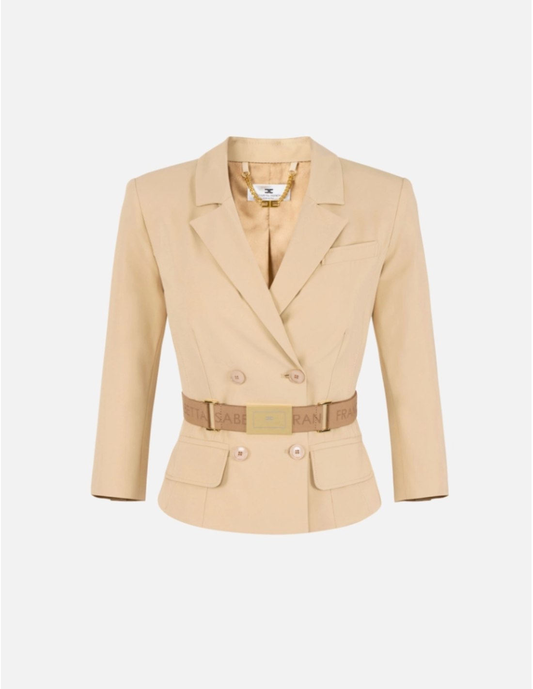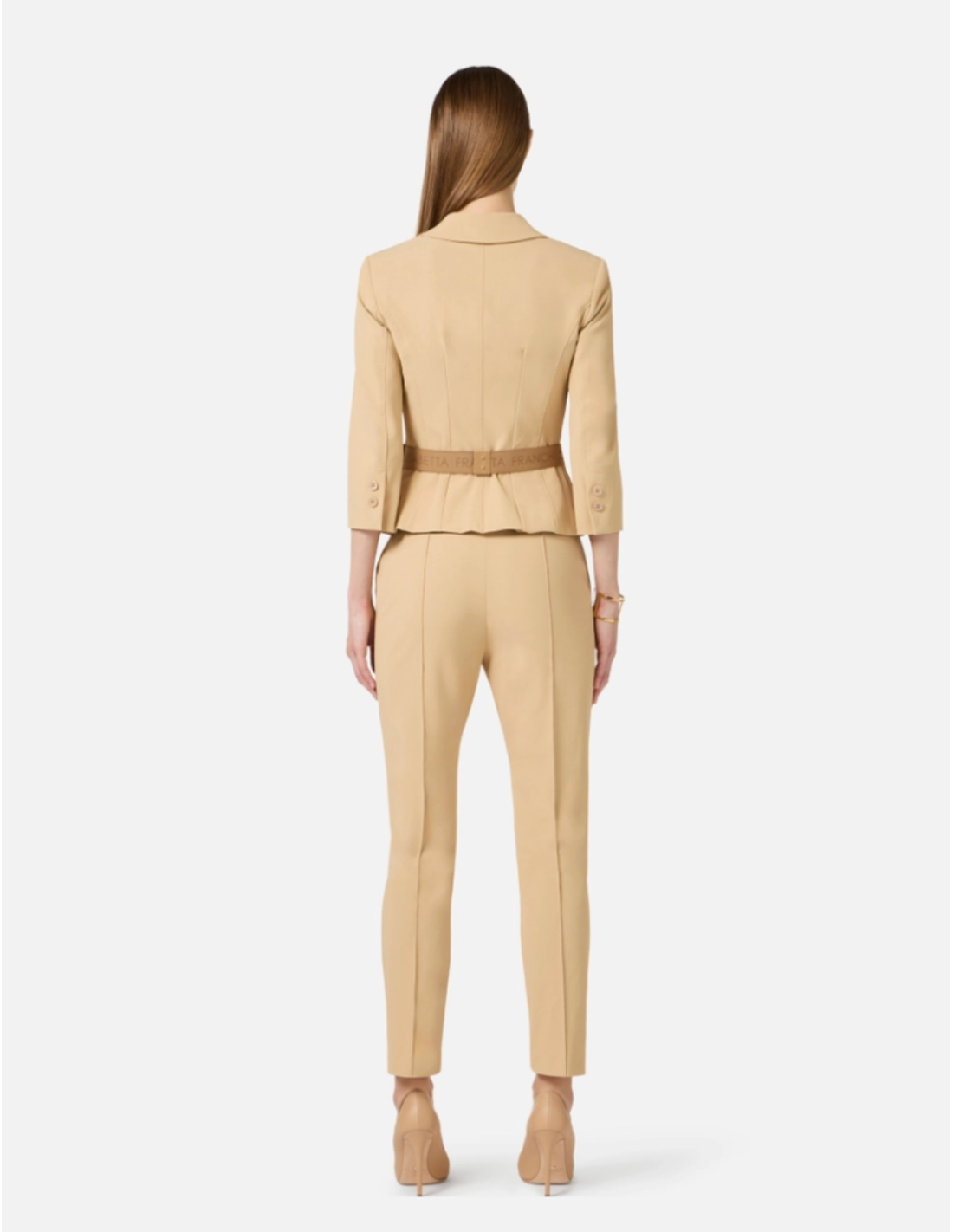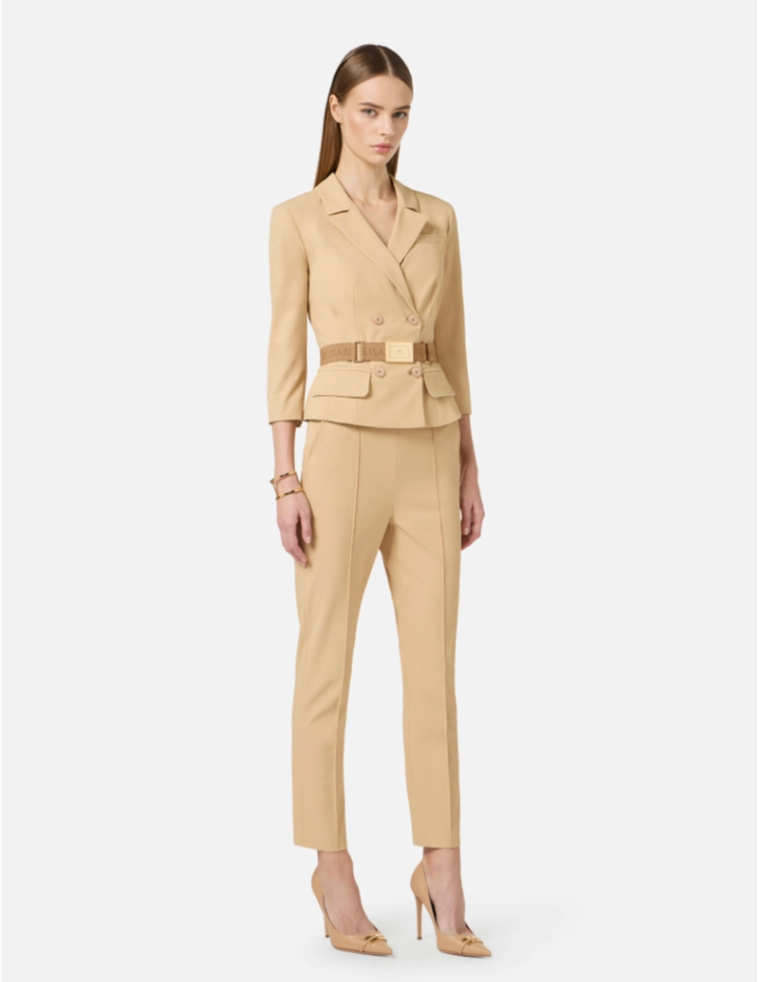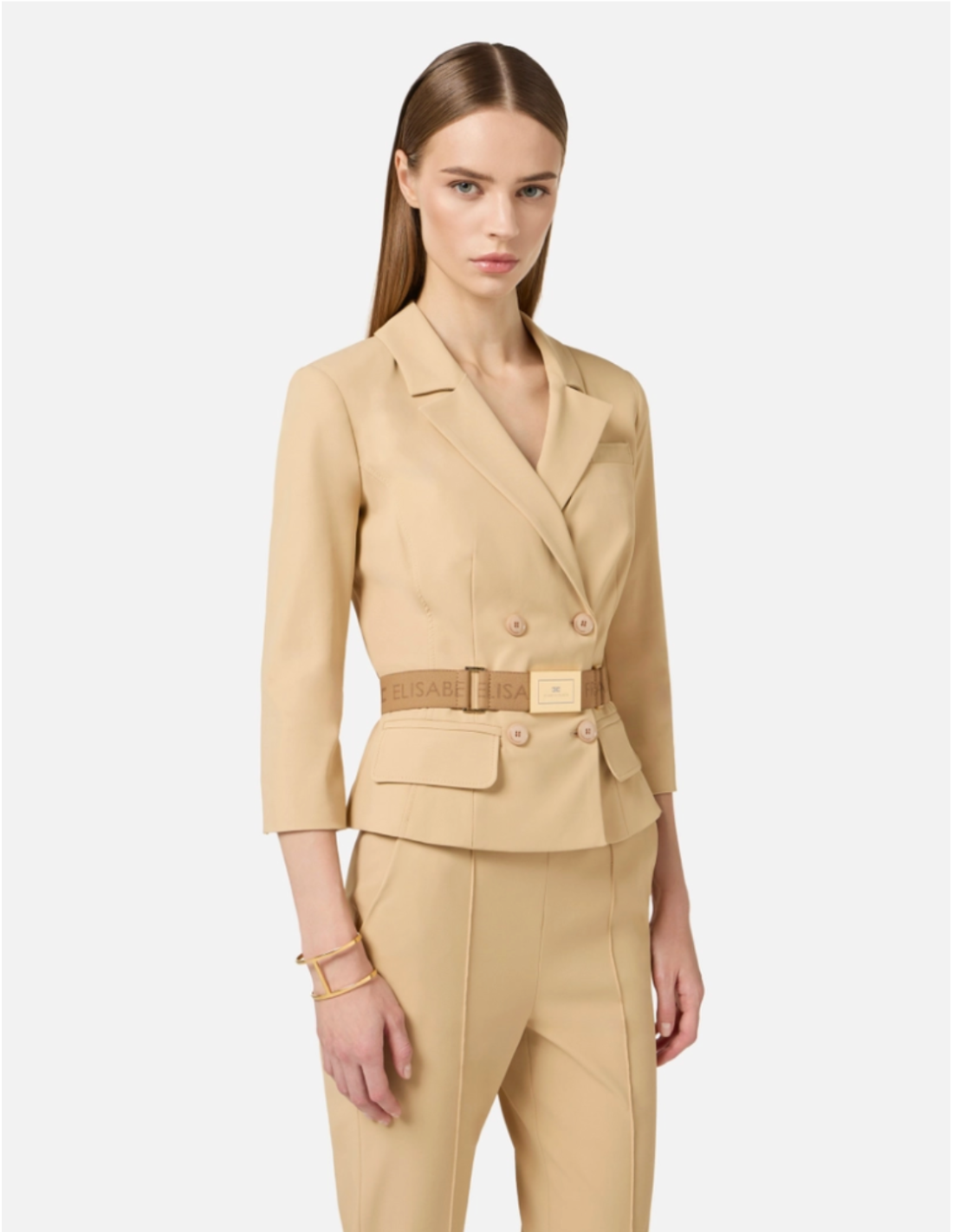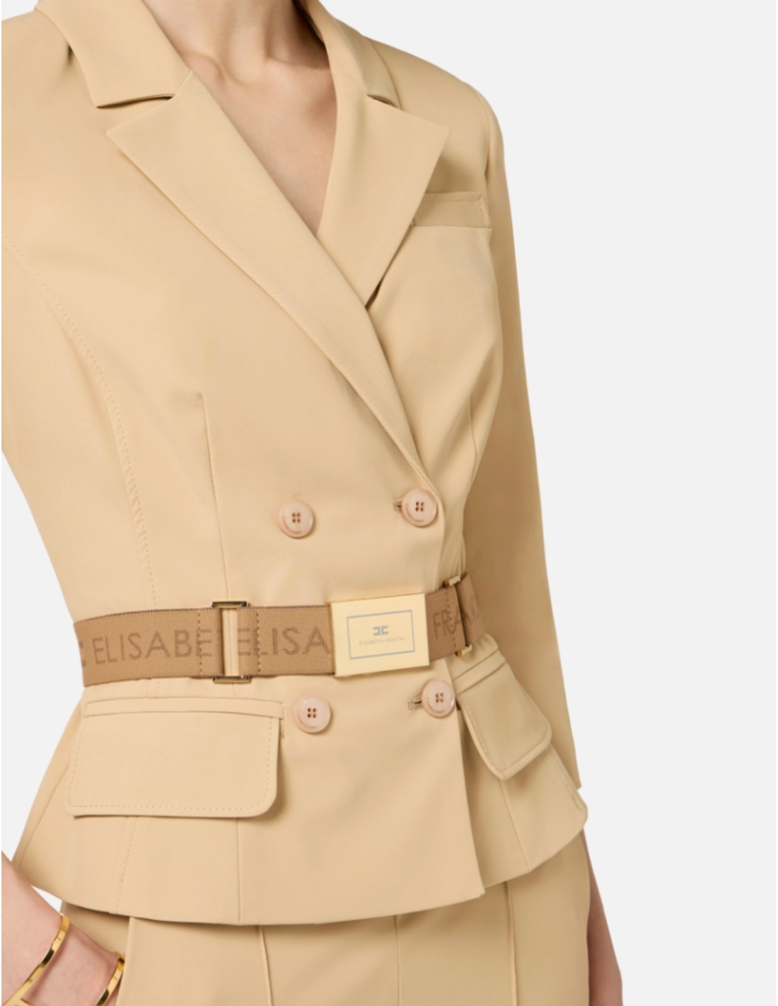 This Elisabetta Franchi technical bi-elastic fabric jacket offers a sophisticated and contemporary look. Its slim fit enhances the silhouette, while the waist belt with a gold-tone metal plaque featuring a laser-engraved logo adds a refined and luxurious touch.