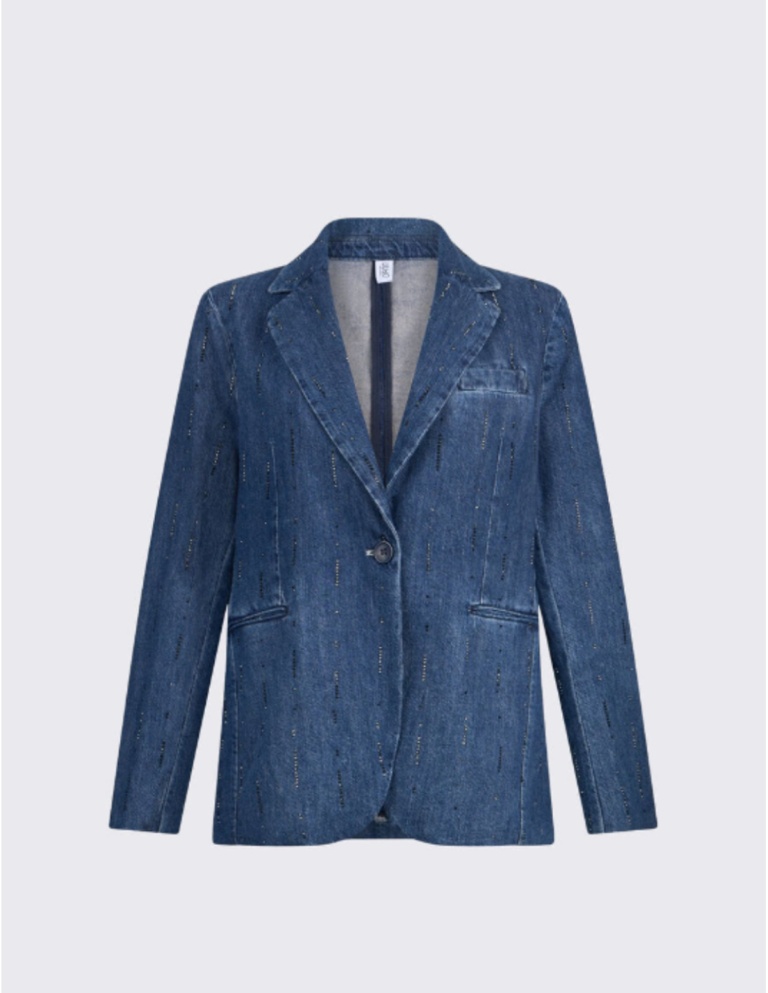 This denim blazer with strass is a standout piece that combines casual comfort with sparkling sophistication. The strass accents add a luminous touch that elevates any outfit.