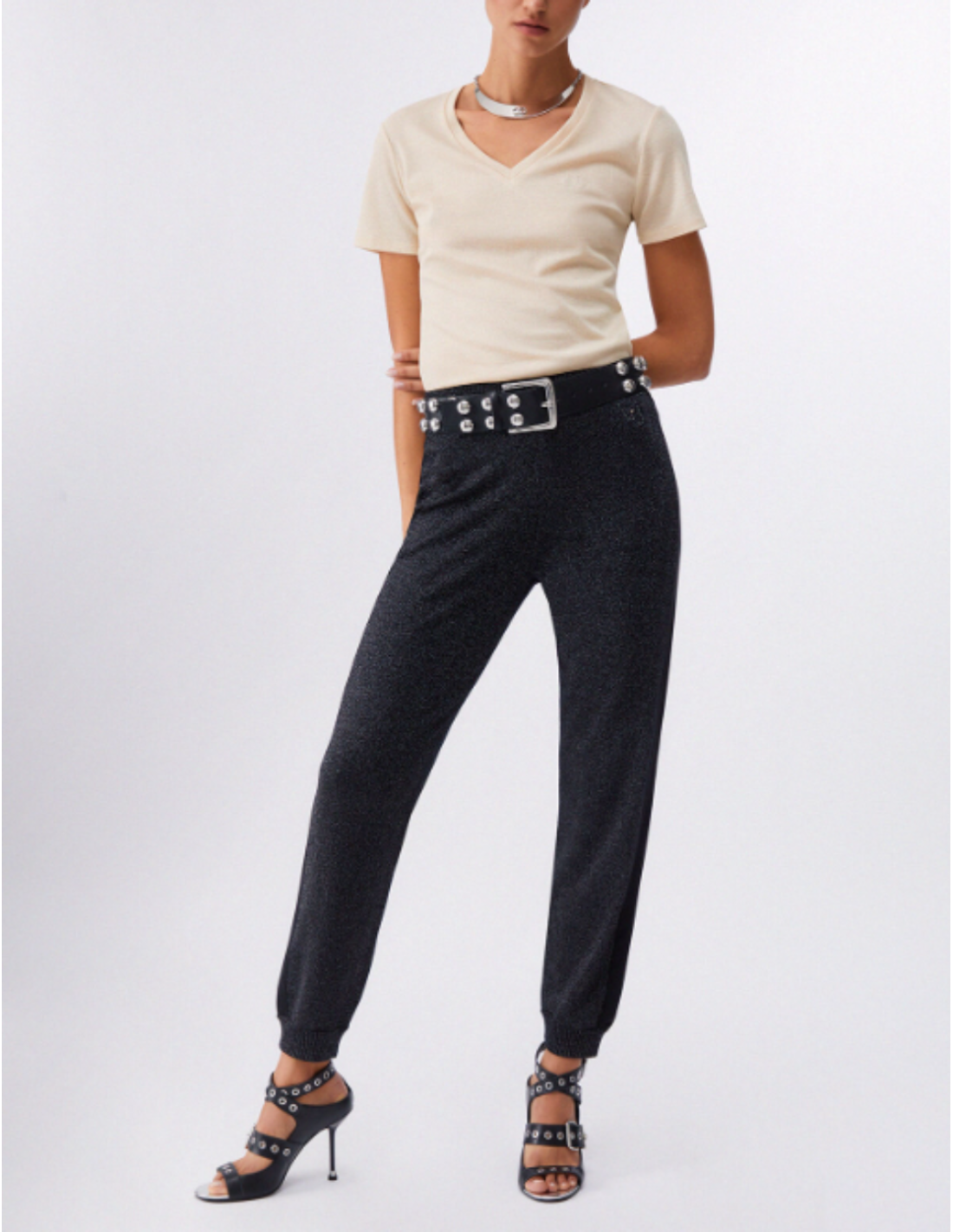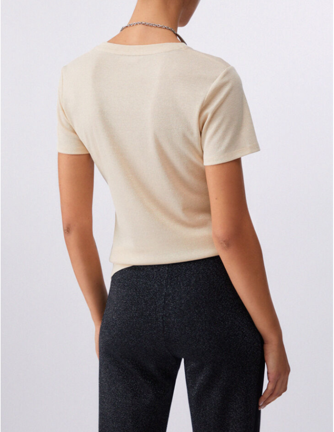 Our V‑neck t‑shirt is a versatile and stylish piece that pairs comfort with contemporary flair. Its ribbed knit fabric flatters the figure while the subtle shimmer adds a refined touch to everyday outfits.