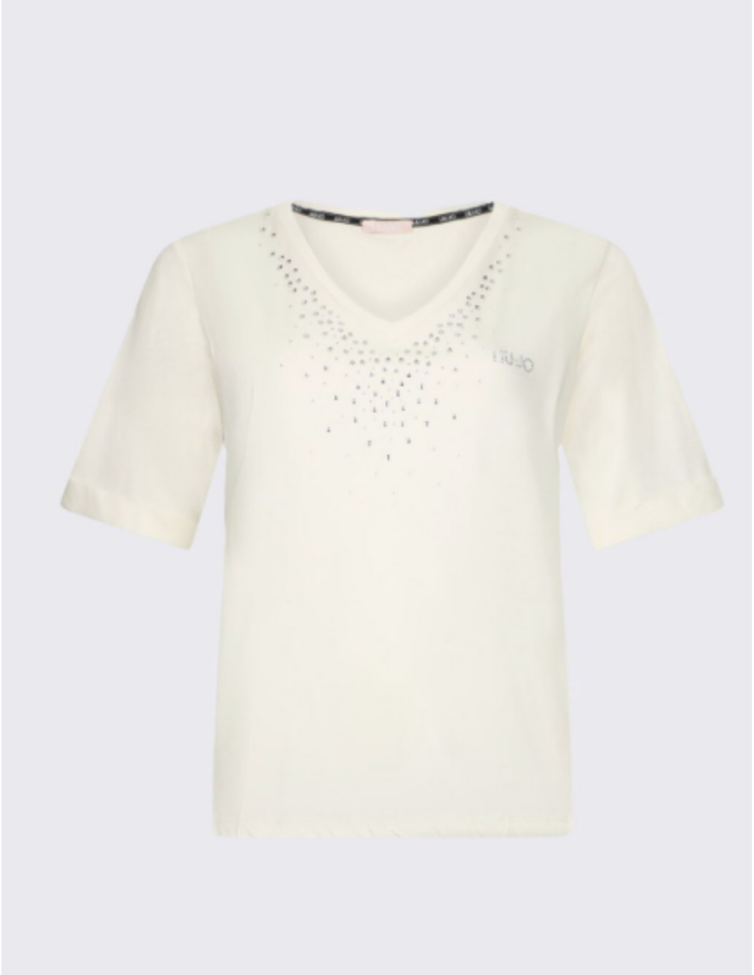 This white cotton jersey t‑shirt blends comfort with modern style. It features a V‑neck, appliqué rhinestones, and short sleeves with turn‑ups for a refined casual touch. A small logo detail completes the look with subtle elegance.