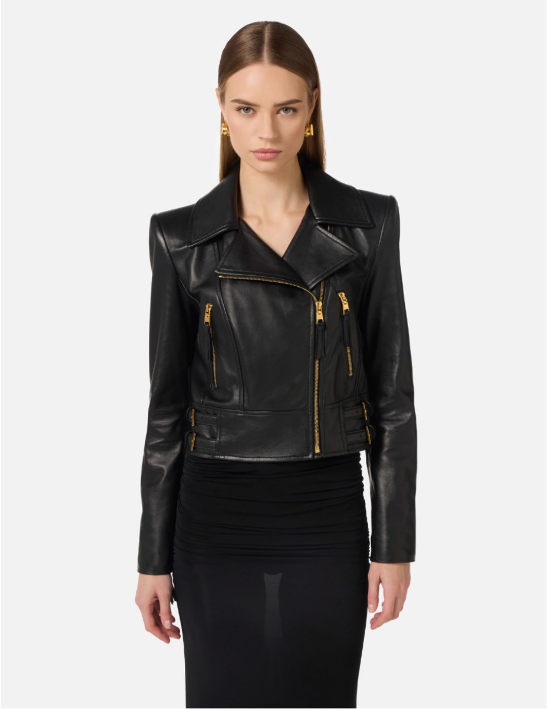 This leather biker jacket by Elisabetta Franchi evokes classic motorcycle styles with its asymmetrical zip, lapels, zippered pockets, and padded shoulders. Reinterpreted with structured tailoring and gleaming gold metal rings, it exudes edgy elegance. :contentReference[oaicite:3]{index=3}