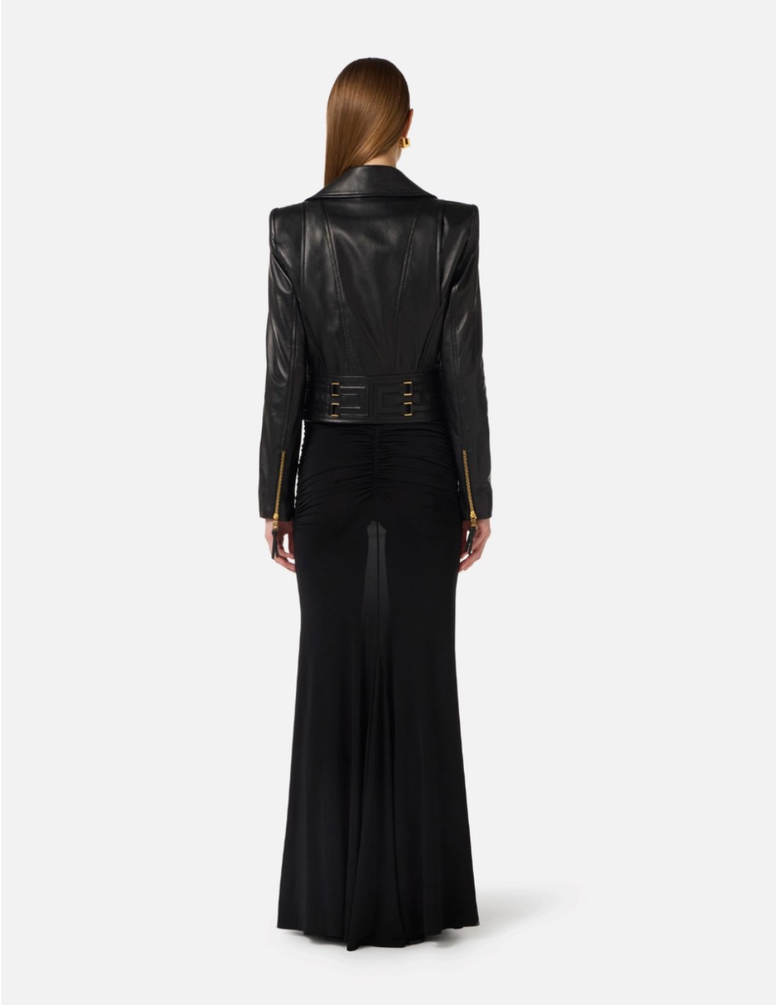 This leather biker blends edgy motorcycle heritage with refined contemporary details. The structured shoulders and gold metal accents highlight the silhouette, creating a standout piece for versatile styling.