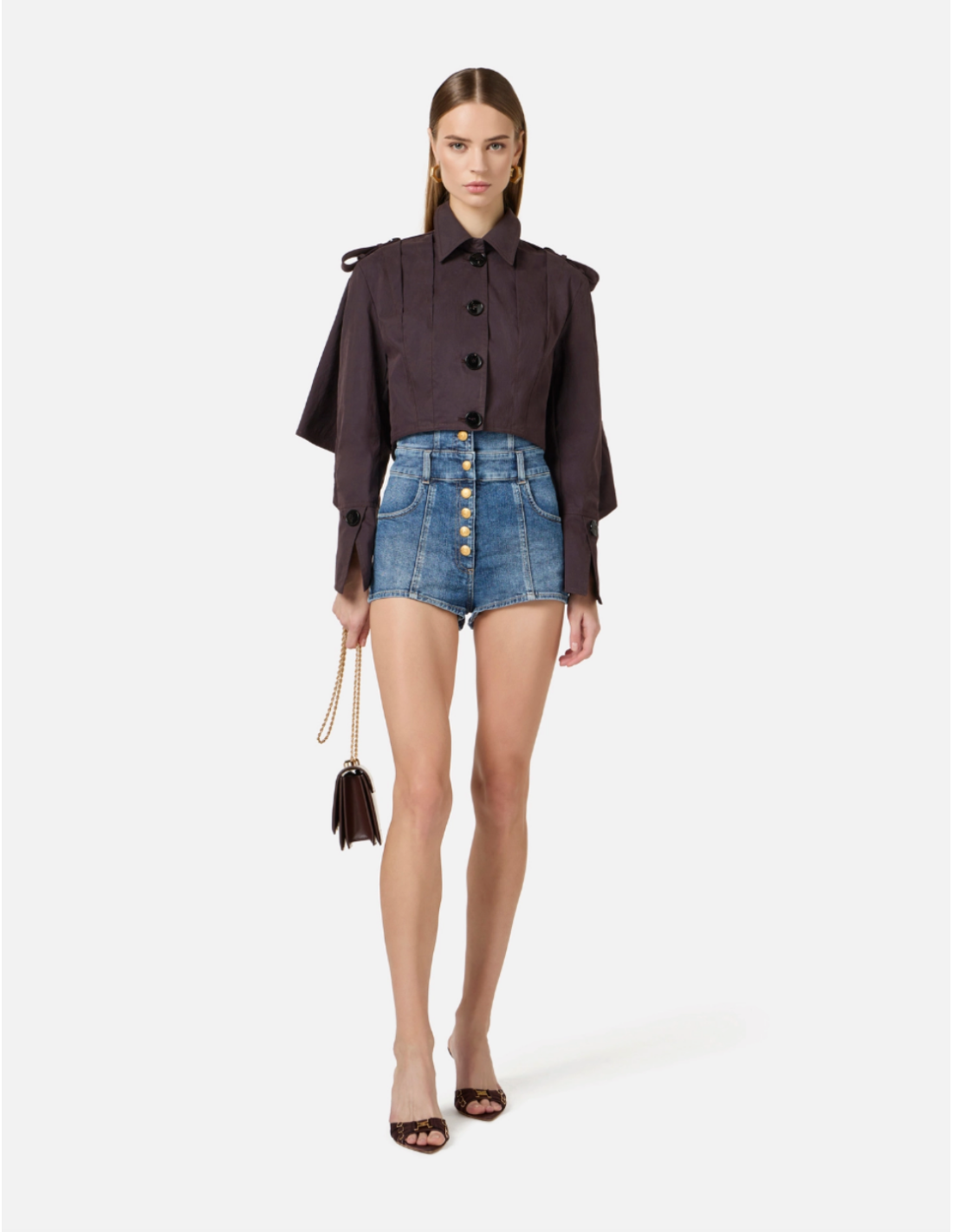 Our high-waist denim shorts are a bold piece blending couture inspiration with modern elegance. The structured design highlights the silhouette while the golden details elevate the denim with sophistication.