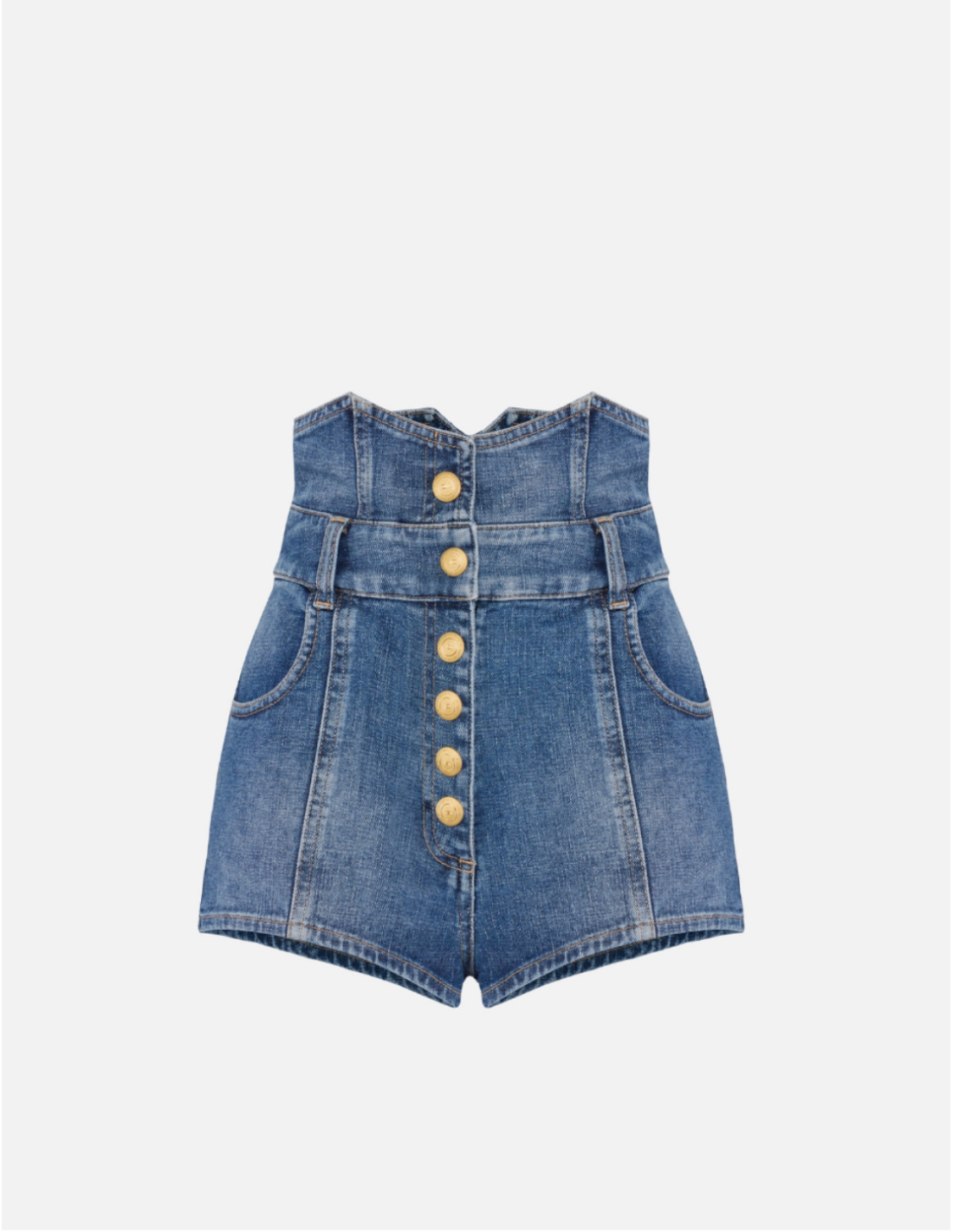 These high-waist denim shorts combine modern design with feminine structure inspired by corsetry. The bustier-style cuts on the front and back shape the silhouette, while the gold-tone logo metal buttons add a luminous and sophisticated touch.