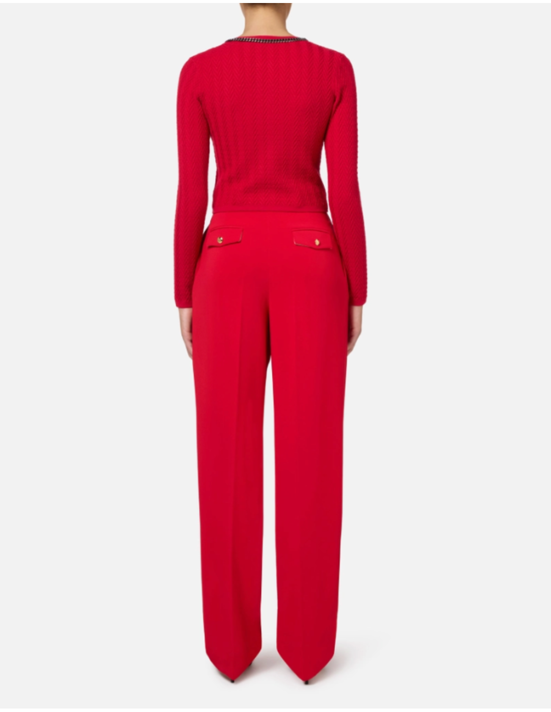 Ce pantalon droit en crêpe stretch Elisabetta Franchi séduit par sa coupe élégante et son rouge profond, emblématique d’une allure féminine affirmée. Grâce à sa matière légèrement extensible, il offre un tombé fluide et confortable, idéal pour des silhouettes sophistiquées du matin au soir. Les doubles pinces apportent structure et raffinement à cette pièce iconique de la saison.