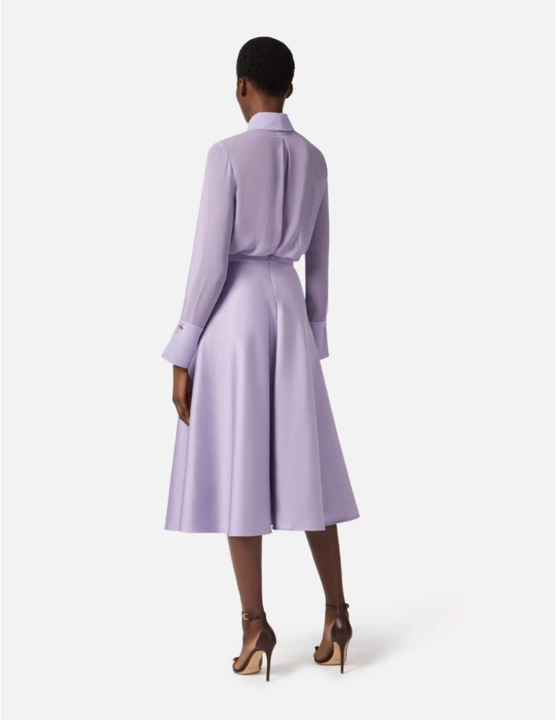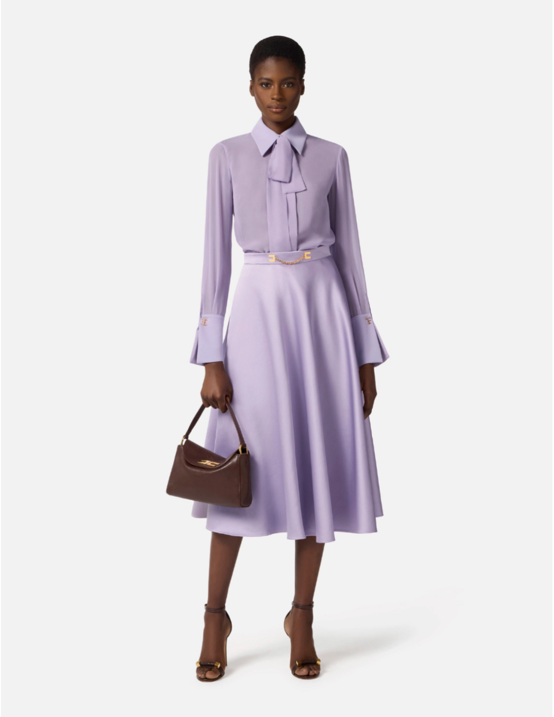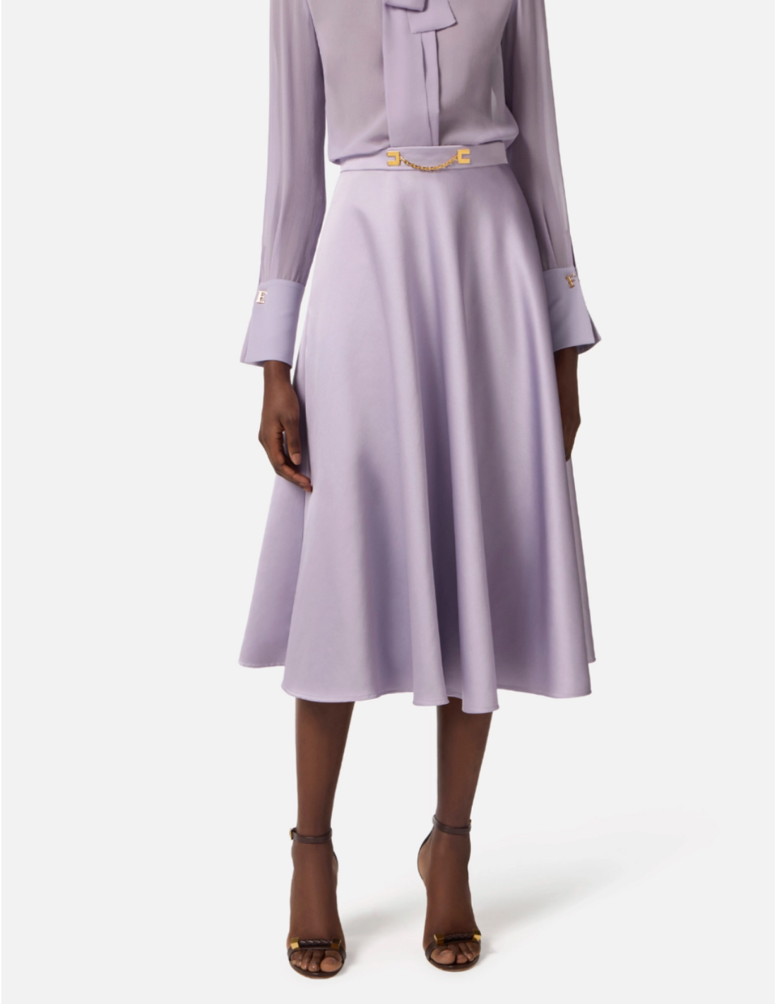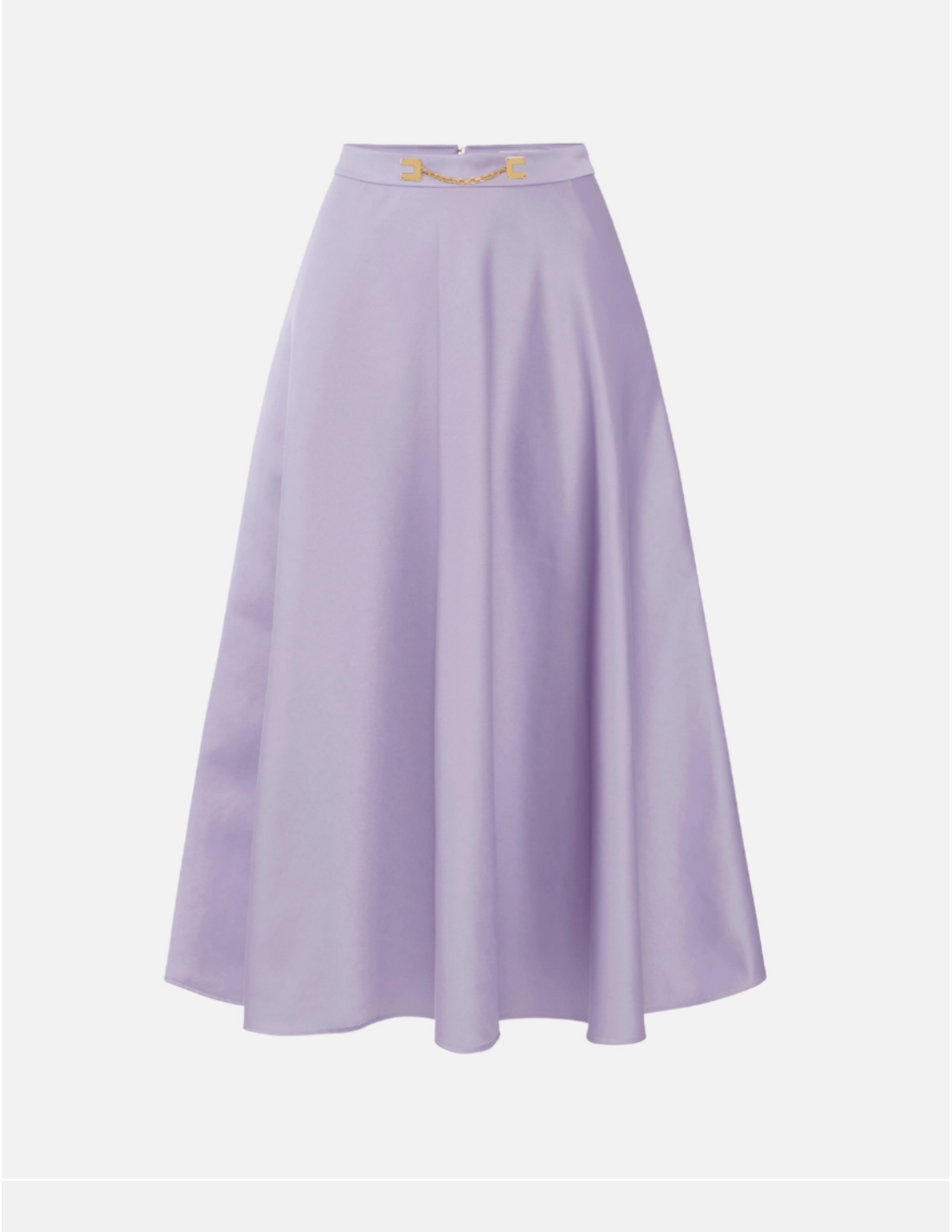 This Elisabetta Franchi duchess skirt with jewel logo stands out with its elegant cut and wide waistband adorned with a golden metal logo chain. The circle design creates a dynamic and sophisticated silhouette.