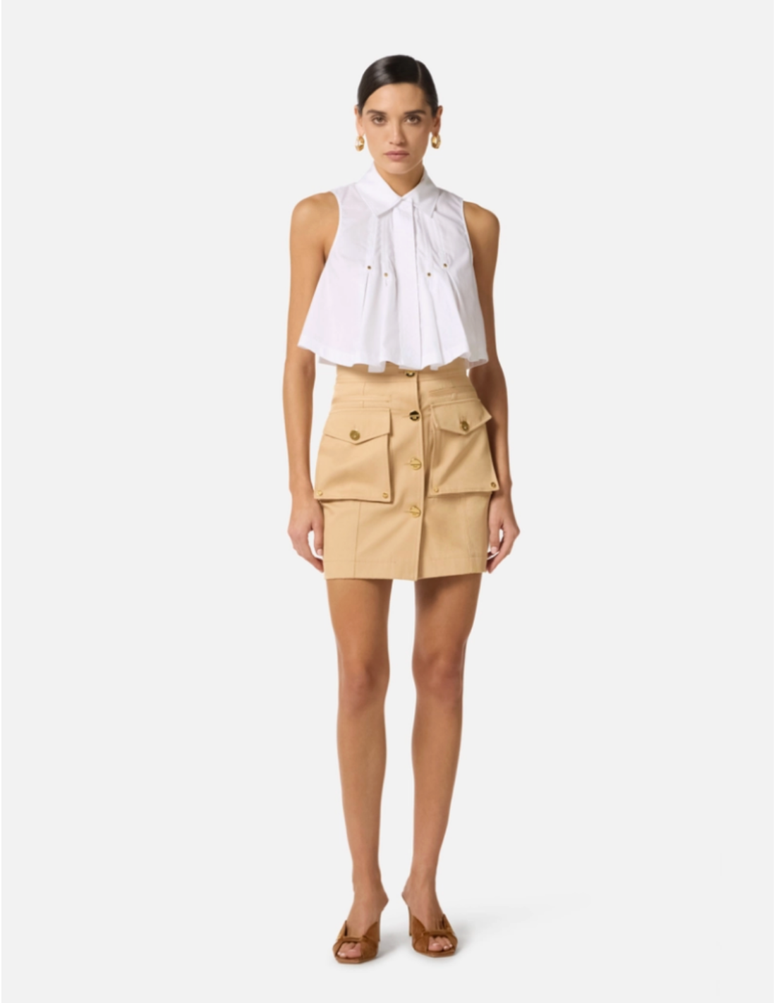This Elisabetta Franchi cotton gabardine mini-skirt with large pockets updates utilitarian chic with a structured regular fit and roomy cargo pockets that add both function and character. Golden metal buttons with logo and rivets add luminous detail and elevate the piece’s refined contemporary design.