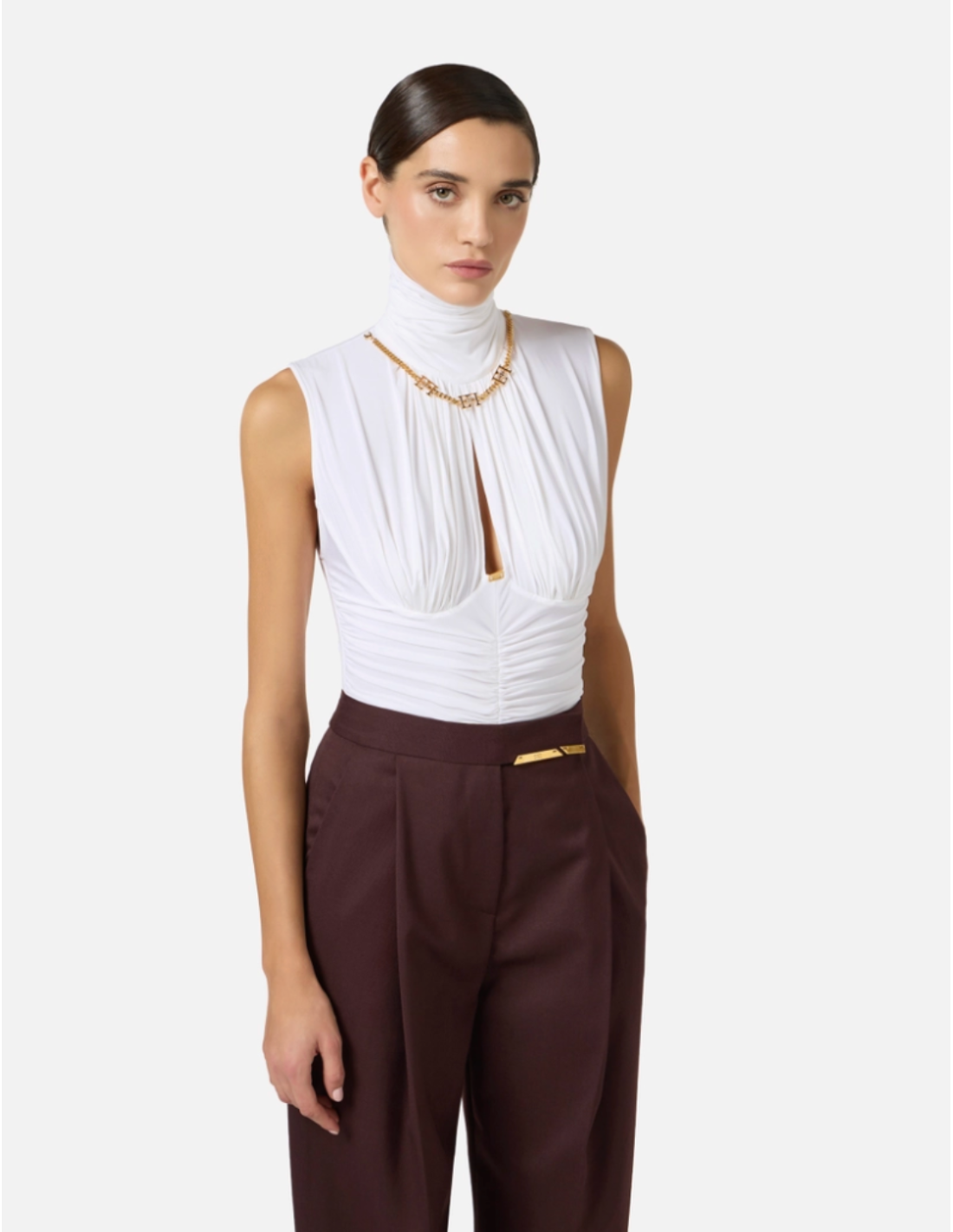 Ce body en jersey crêpe léger reflète l’esprit de la nouvelle collection Elisabetta Franchi : des lignes épurées, des matières confortables et des détails précieux. Une pièce essentielle pour composer des silhouettes modernes et raffinées.