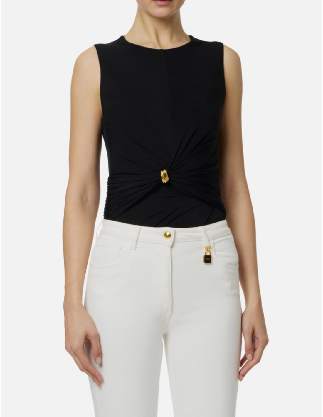 This Elisabetta Franchi jersey top with jewel detail features a sleek slim fit and a beautifully draped front. The central draping is held by a gold metal jewel clasp, creating mesmerizing volume effects on both the front and back for a modern and sophisticated look.