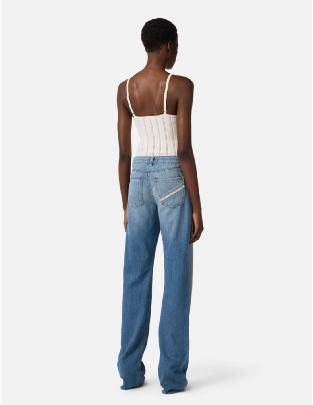 This openwork knit bodysuit highlights feminine elegance with a sophisticated knitted texture designed to enhance the body’s natural lines. The geometric openwork pattern and braided details create a refined and modern aesthetic.