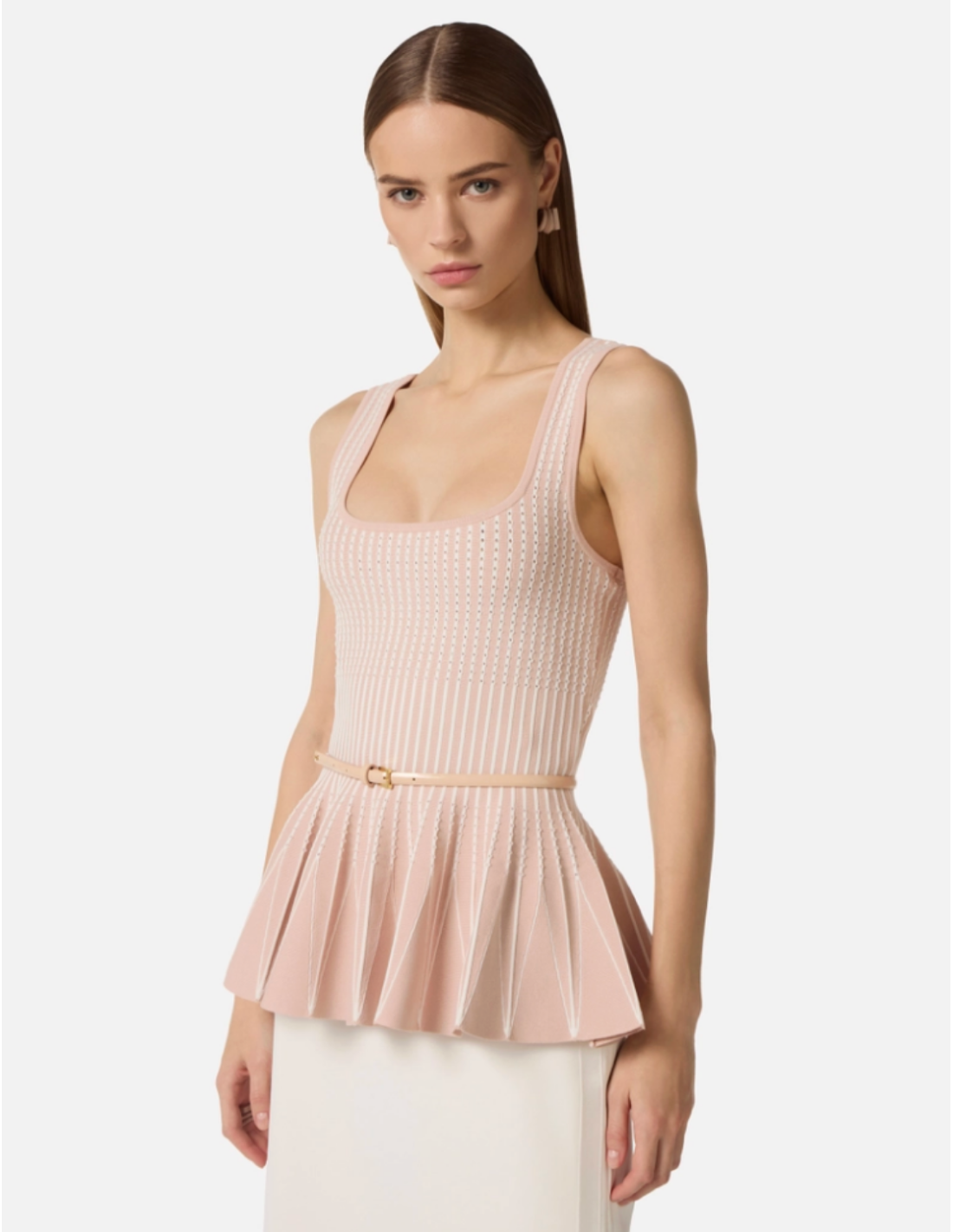 The sleeveless design features a slightly pleated peplum movement that adds fluidity and style, while a waist belt enhances the silhouette for a chic structured look. :contentReference[oaicite:2]{index=2}