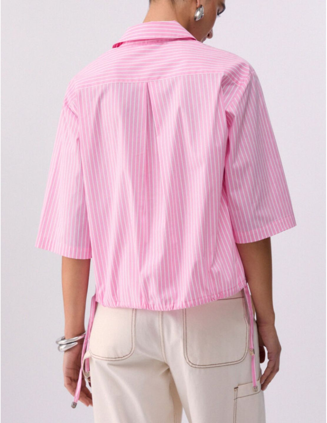 This short-sleeve striped shirt combines summer freshness with modern elegance. Made from cotton poplin, it provides lightweight comfort ideal for warm days. The loose short sleeves and slightly oversized fit create a contemporary and relaxed silhouette.
