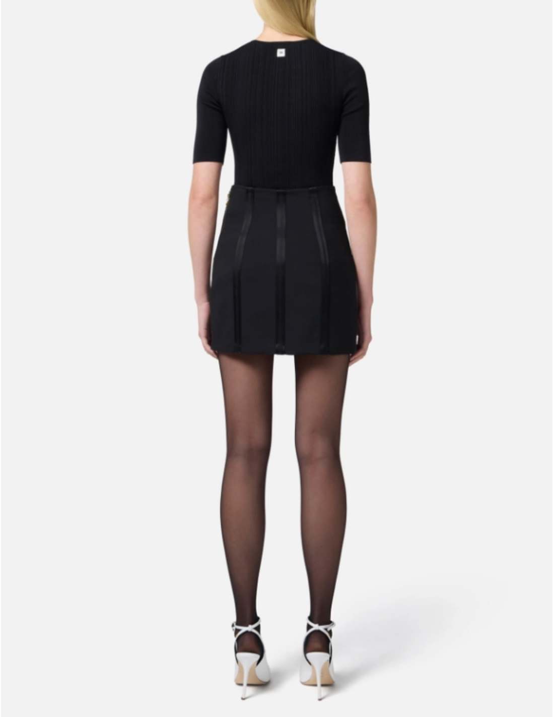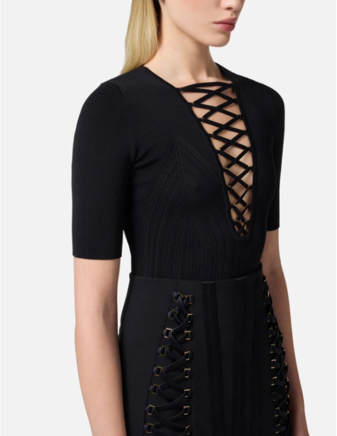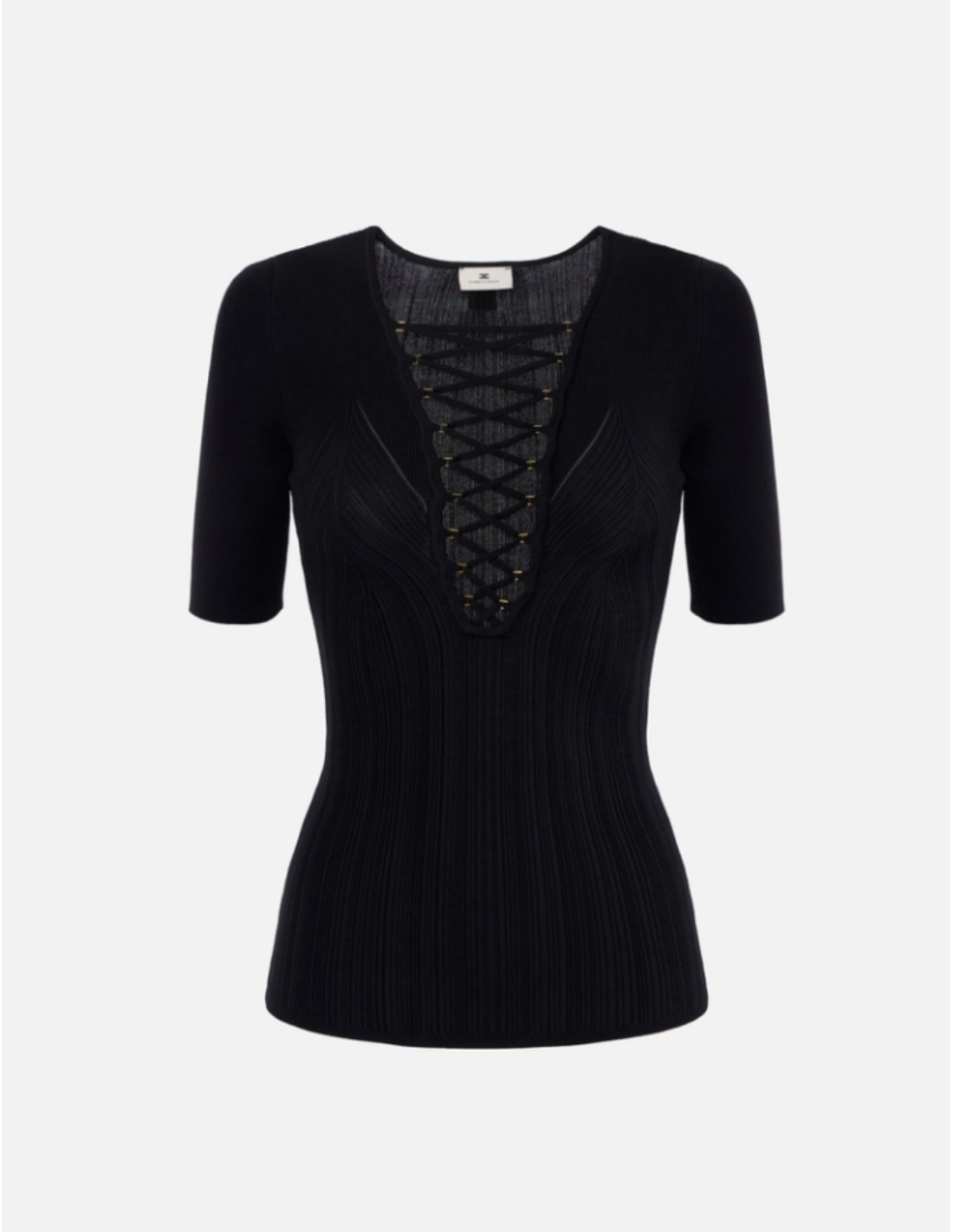 Ce top Elisabetta Franchi en tricot côtelé combine élégance et originalité. Les manches au-dessus du coude et les lacets croisés sur le buste, finis par des anneaux carrés en métal doré, apportent une touche graphique et moderne. Sa coupe cintrée met en valeur la silhouette, tandis que l’étiquette apposée au dos signe l’authenticité de la pièce. Une pièce incontournable de la collection Outlet, idéale pour un look chic et contemporain.