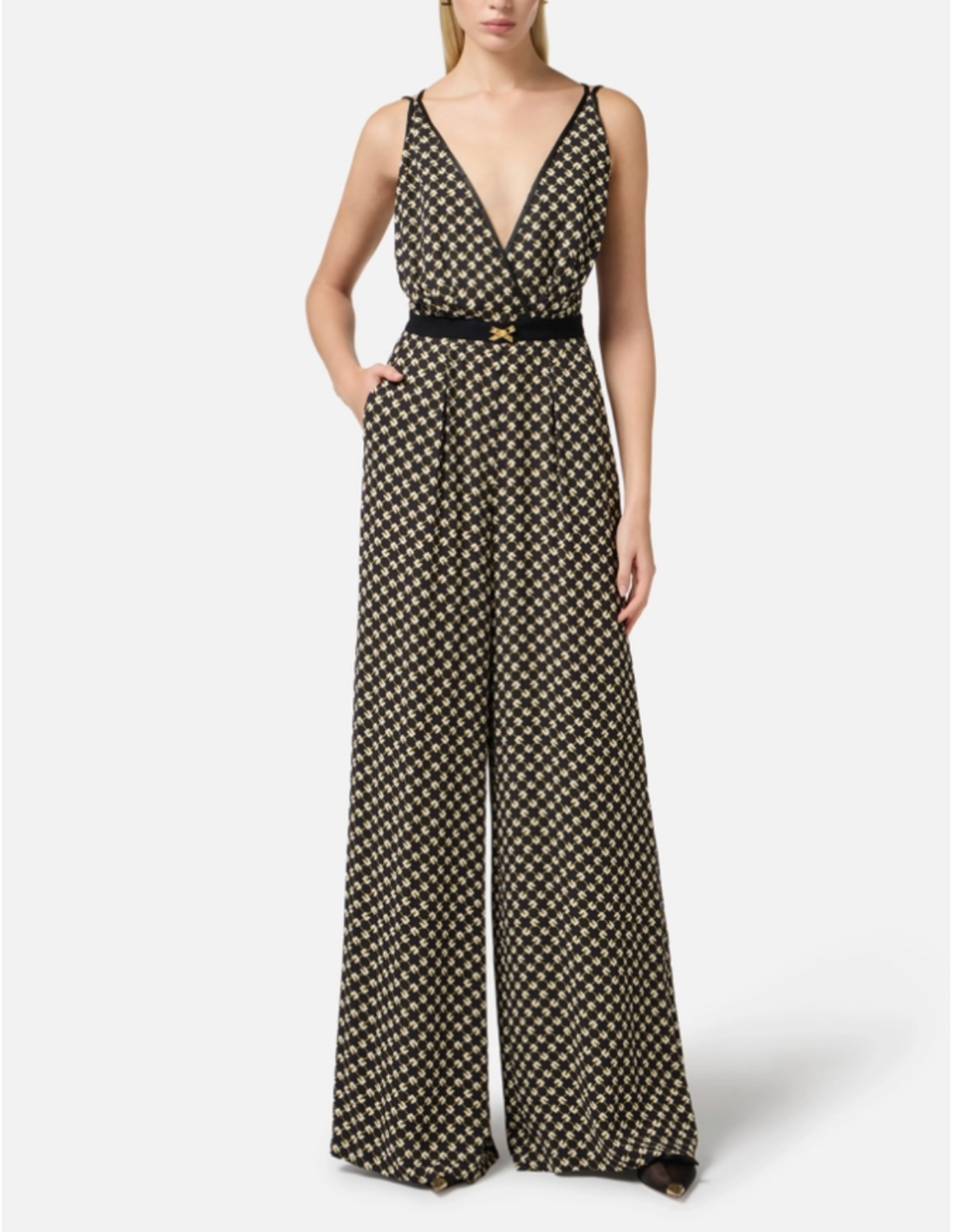 Cette combinaison imprimée Elisabetta Franchi séduit par son élégance fluide et son imprimé losange signature. Conçue en georgette légère, elle présente un décolleté portefeuille flatteur et une coupe ajustée qui souligne la taille grâce à sa ceinture décorée d’un nœud bijou logoté. Son pantalon palazzo allonge la silhouette, créant un look à la fois moderne, féminin et raffiné. Une pièce incontournable de la sélection Outlet.