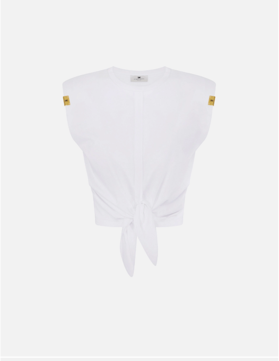 Ce T‑shirt en jersey avec nœud Elisabetta Franchi se distingue par son col ras‑du‑cou, ses épaules structurées et son nœud au bas qui crée une silhouette définie. Les agrafes aux emmanchures et l’imprimé logo au dos apportent des touches lumineuses et contemporaines à ce classique revisité.