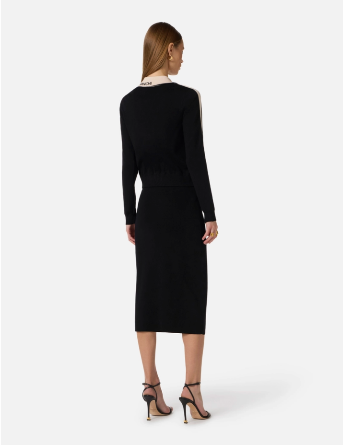 Cette veste en tricot avec bandes en viscose brillante Elisabetta Franchi est une pièce sophistiquée qui combine confort et style contemporain. Elle se distingue par ses bandes en viscose brillante contrastées et une finition jacquard appliquée au logo sur le col, créant un design graphique affirmé, tandis que la fermeture zippée en métal doré ajoute une note lumineuse à l’ensemble.