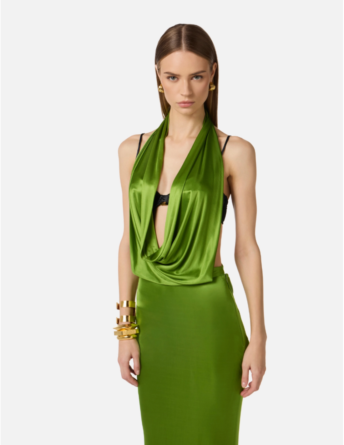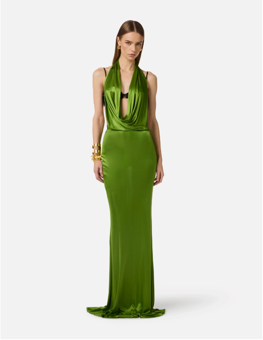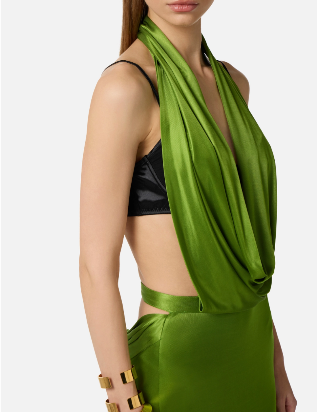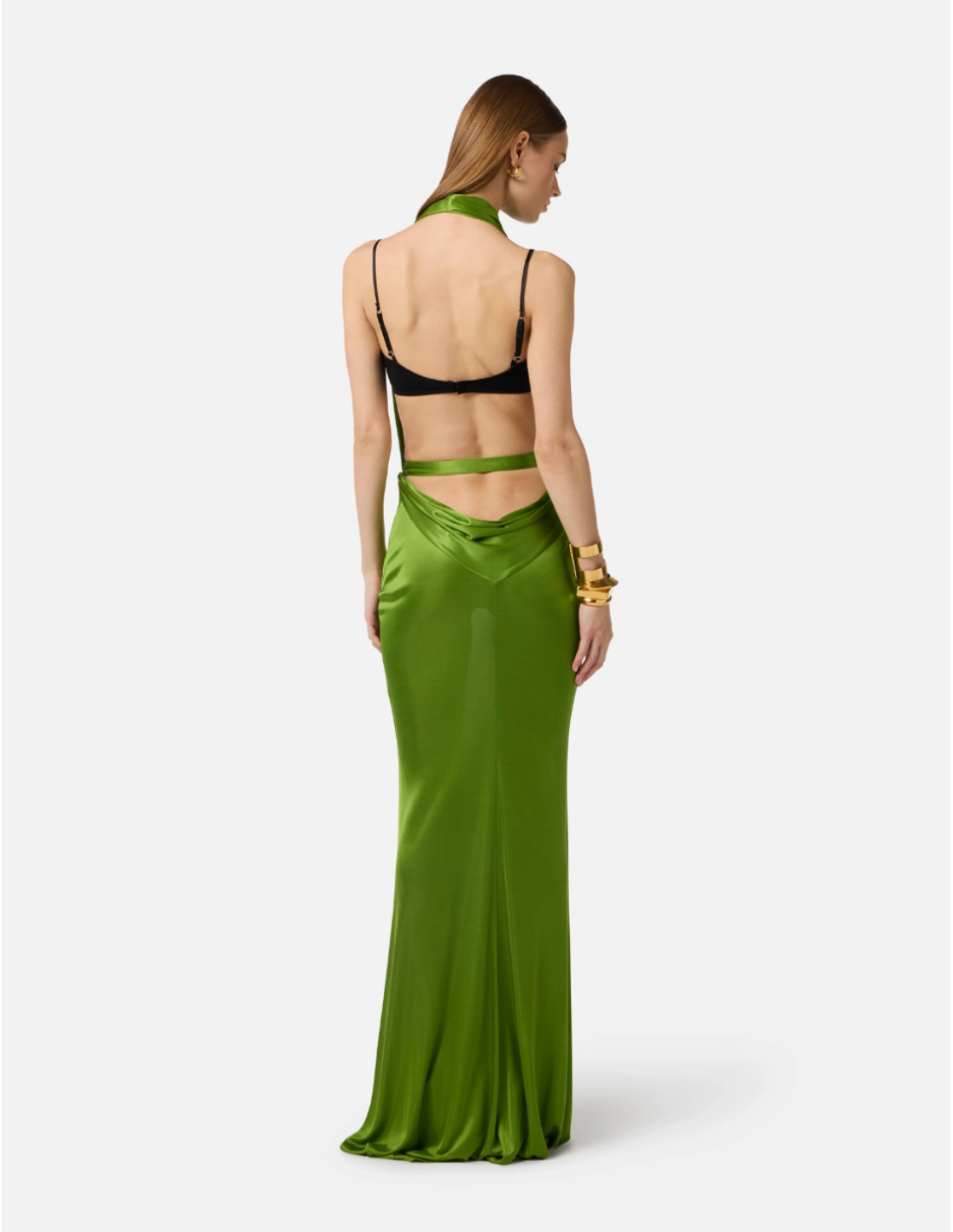 Cette robe en viscose brillante est conçue pour les occasions qui nécessitent une allure raffinée et impactante. Le drapé sophistiqué et le dos ouvert créent une ligne harmonieuse tandis que la matière brillante capte la lumière pour une présence remarquée.