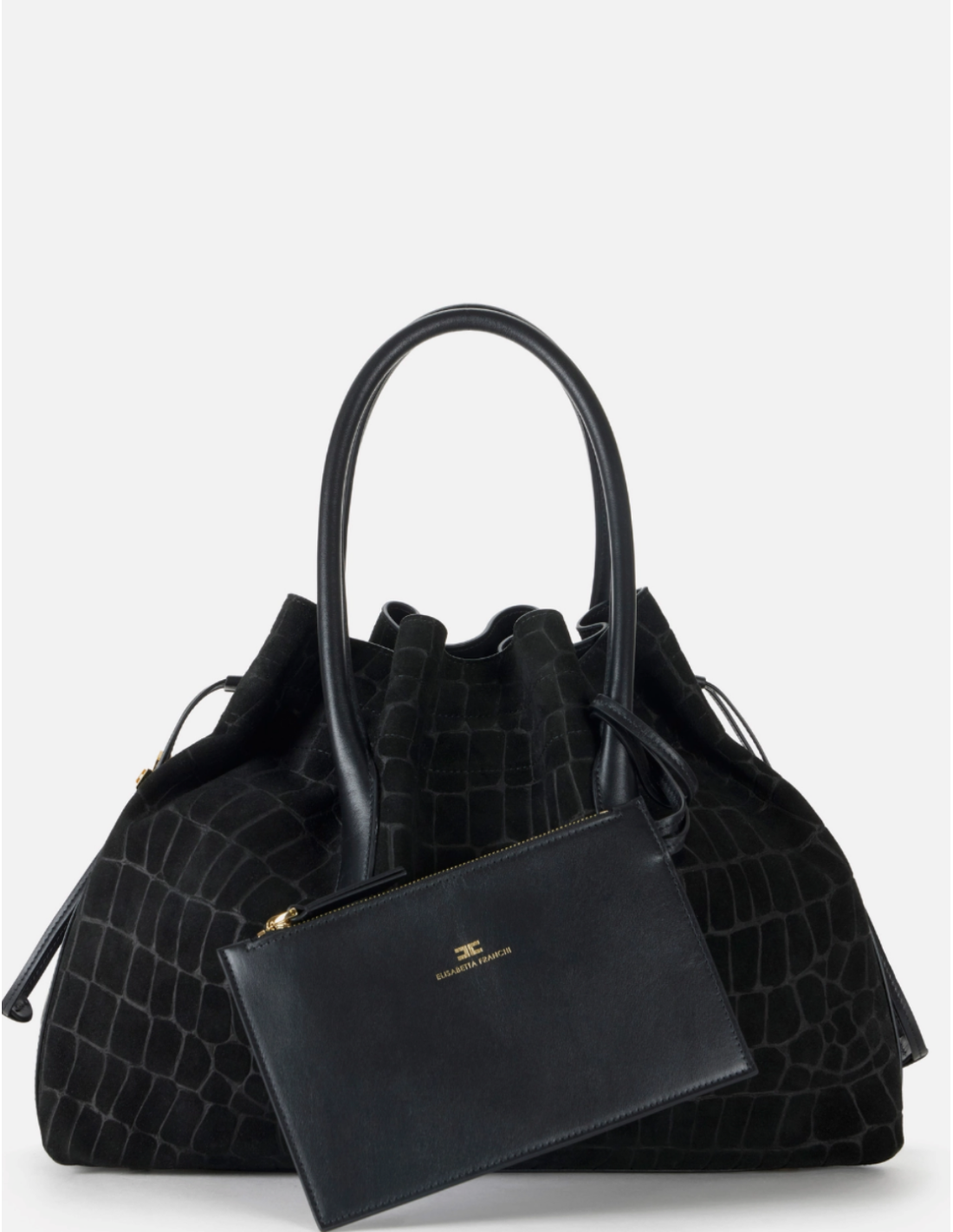 Ce sac en suède avec imprimé croco Elisabetta Franchi associe une silhouette raffinée à une texture sophistiquée. Confectionné en cuir suédé véritable, il présente un design type mallette, des poignées tubulaires confortables, une fermeture à coulisse ainsi que des pieds de fond pour assurer stabilité et longévité.