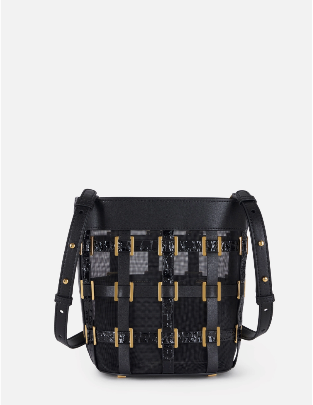 Ce sac seau en filet avec anneaux joue avec les textures pour une allure originale et sophistiquée. Réalisé en matériau synthétique effet cuir avec micro‑mesh, il se distingue par sa structure en filet élégante et légère.