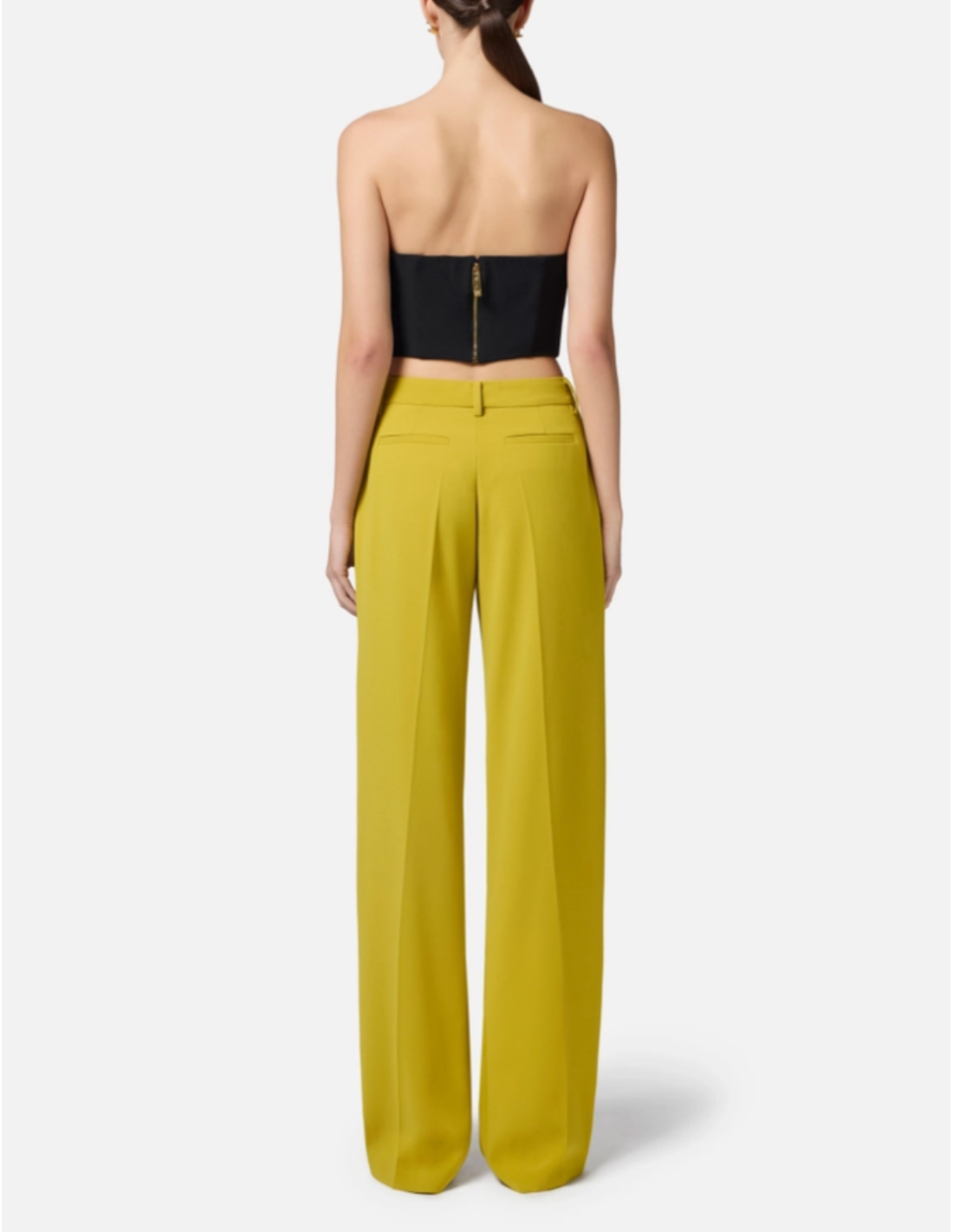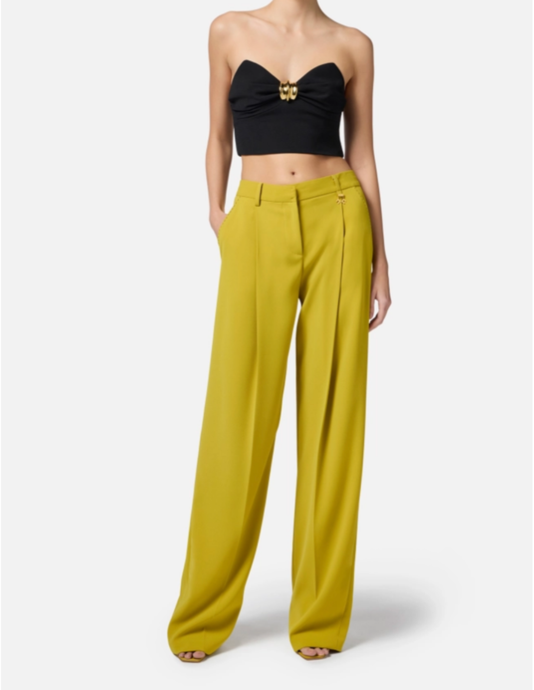Ce bustier Elisabetta Franchi séduit par son crêpe fluide et son élégance sculptée. Sa structure renforcée par des baleines latérales et arrière assure un maintien impeccable, tandis que son bijou signature en métal doré façon nœud apporte une touche iconique et lumineuse. Une pièce raffinée pensée pour sublimer la silhouette avec sophistication.