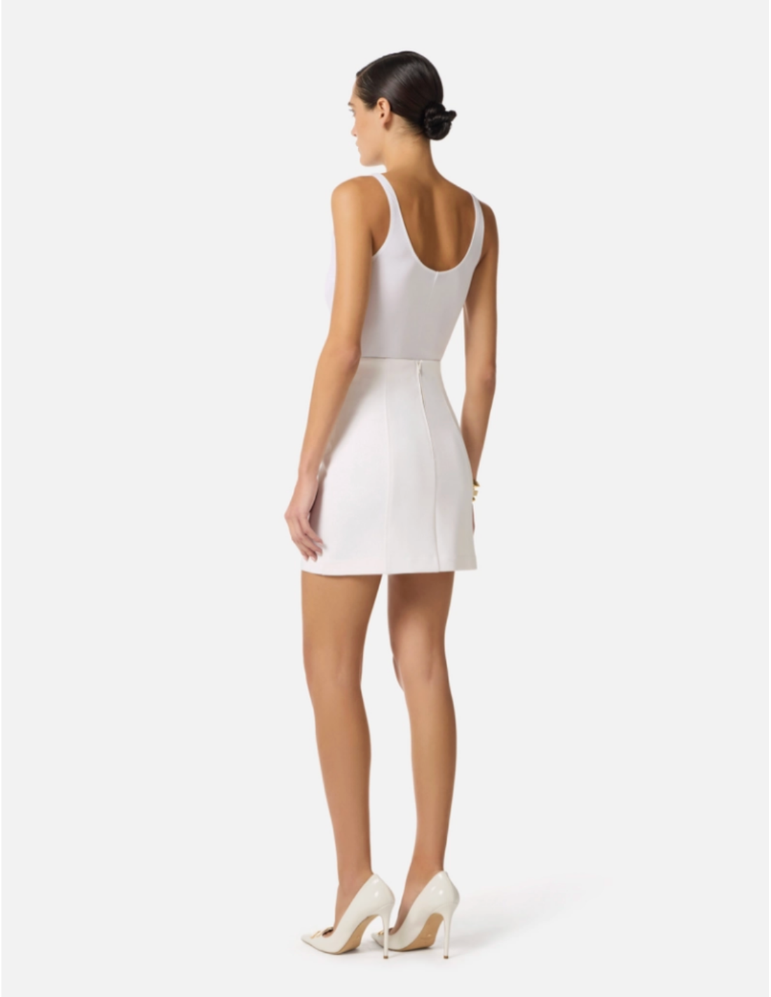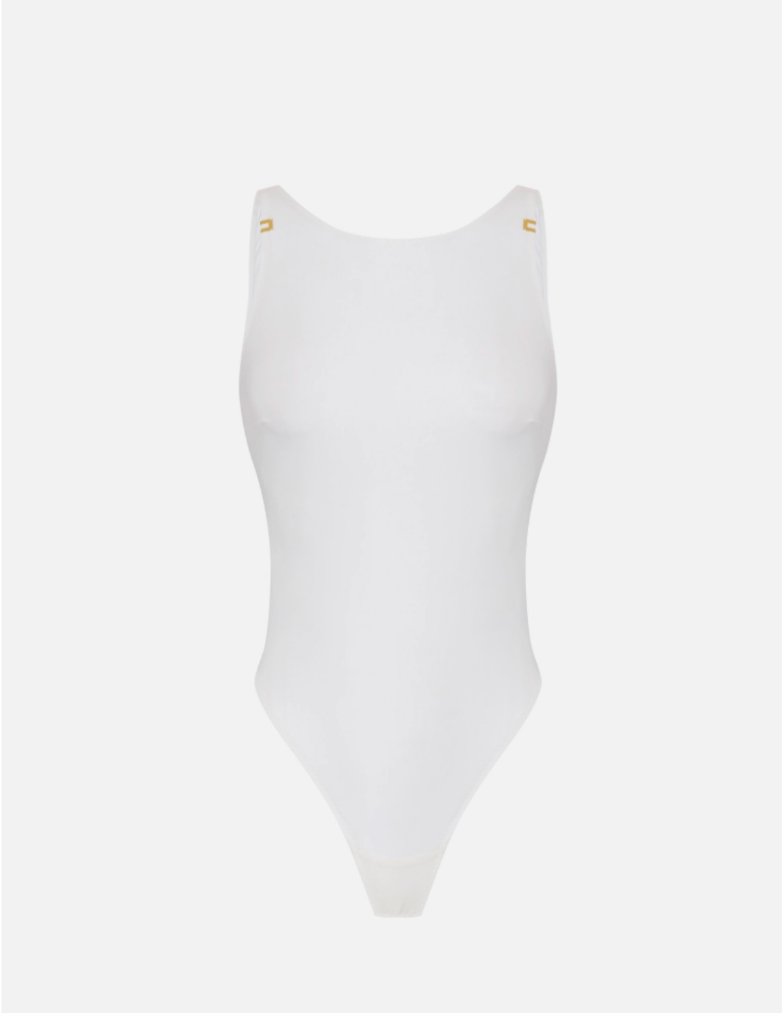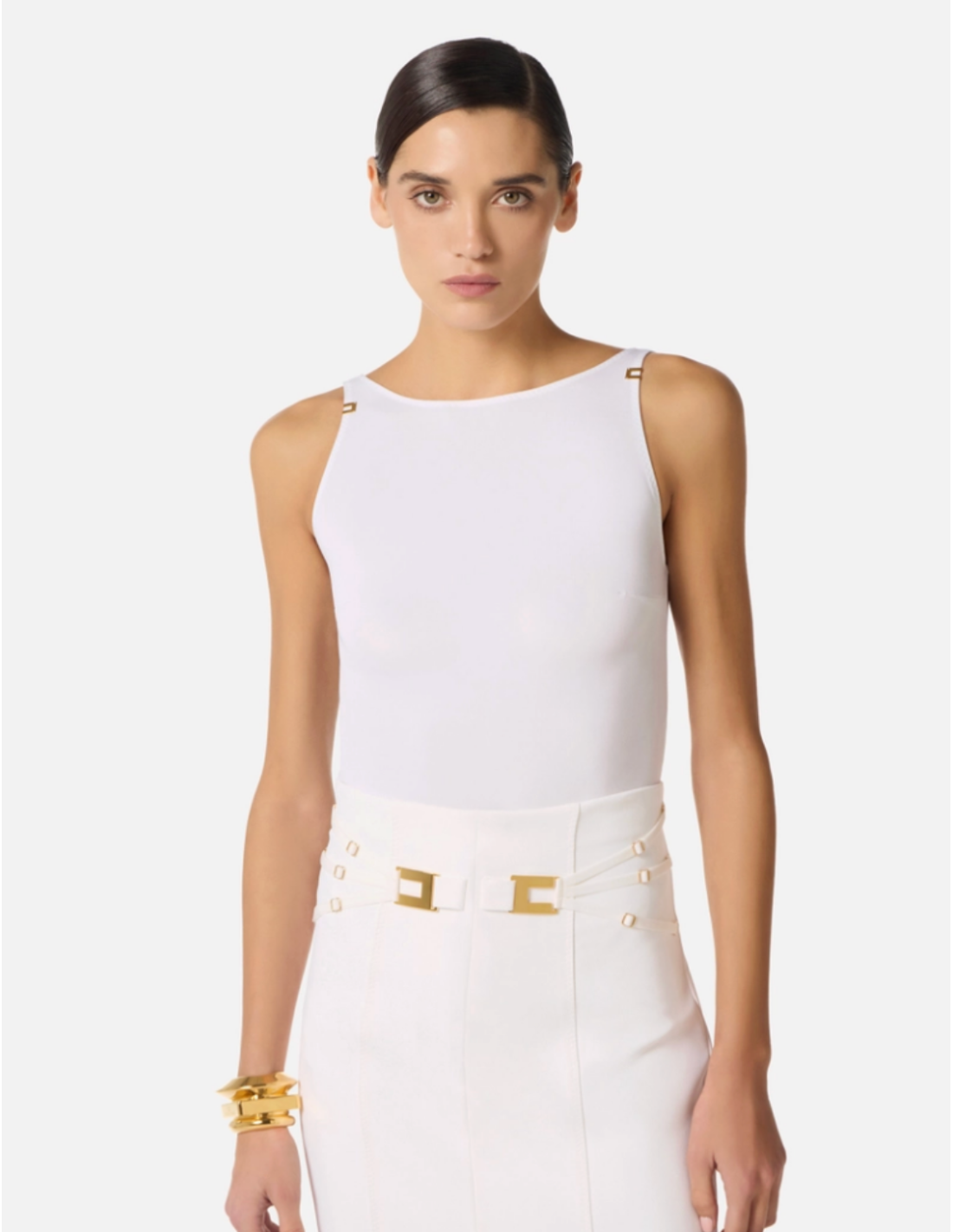 Ce body en jersey crêpe incarne une élégance moderne et raffinée. Sa ligne épurée sans manches met en valeur la silhouette tandis que les détails en métal doré avec logo sur les épaules apportent une touche lumineuse et distinctive.