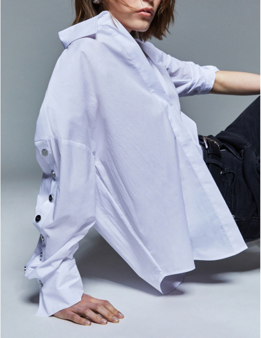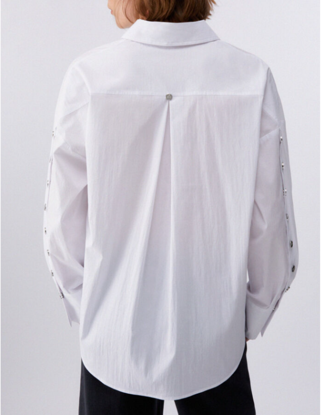Cette chemise en popeline avec clous est une pièce élégante qui allie confort et style. Son design fluide et ses détails métalliques permettent de composer des tenues à la fois féminines et contemporaines.