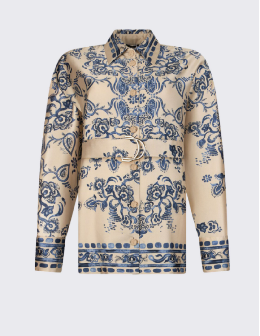 Cette chemise avec imprimé foulard se distingue par son motif graphique inspiré des foulards iconiques. Confectionnée dans un twill fluide, elle offre un tombé élégant et confortable. Sa coupe légèrement oversize et sa ceinture ton sur ton permettent de structurer la silhouette tout en conservant une allure moderne et raffinée.