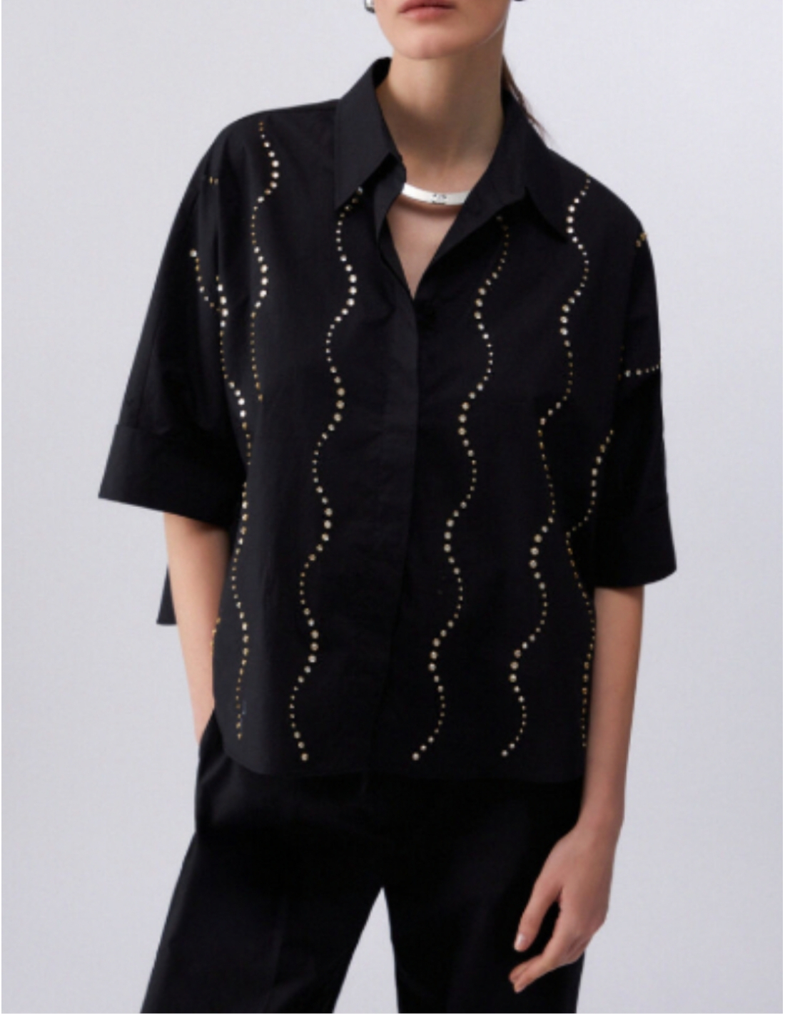 Cette chemise bijoux est une pièce forte qui dynamise votre vestiaire. Sa coupe légèrement oversize structure la silhouette tandis que les détails précieux captent subtilement la lumière.
