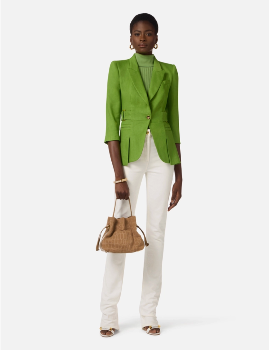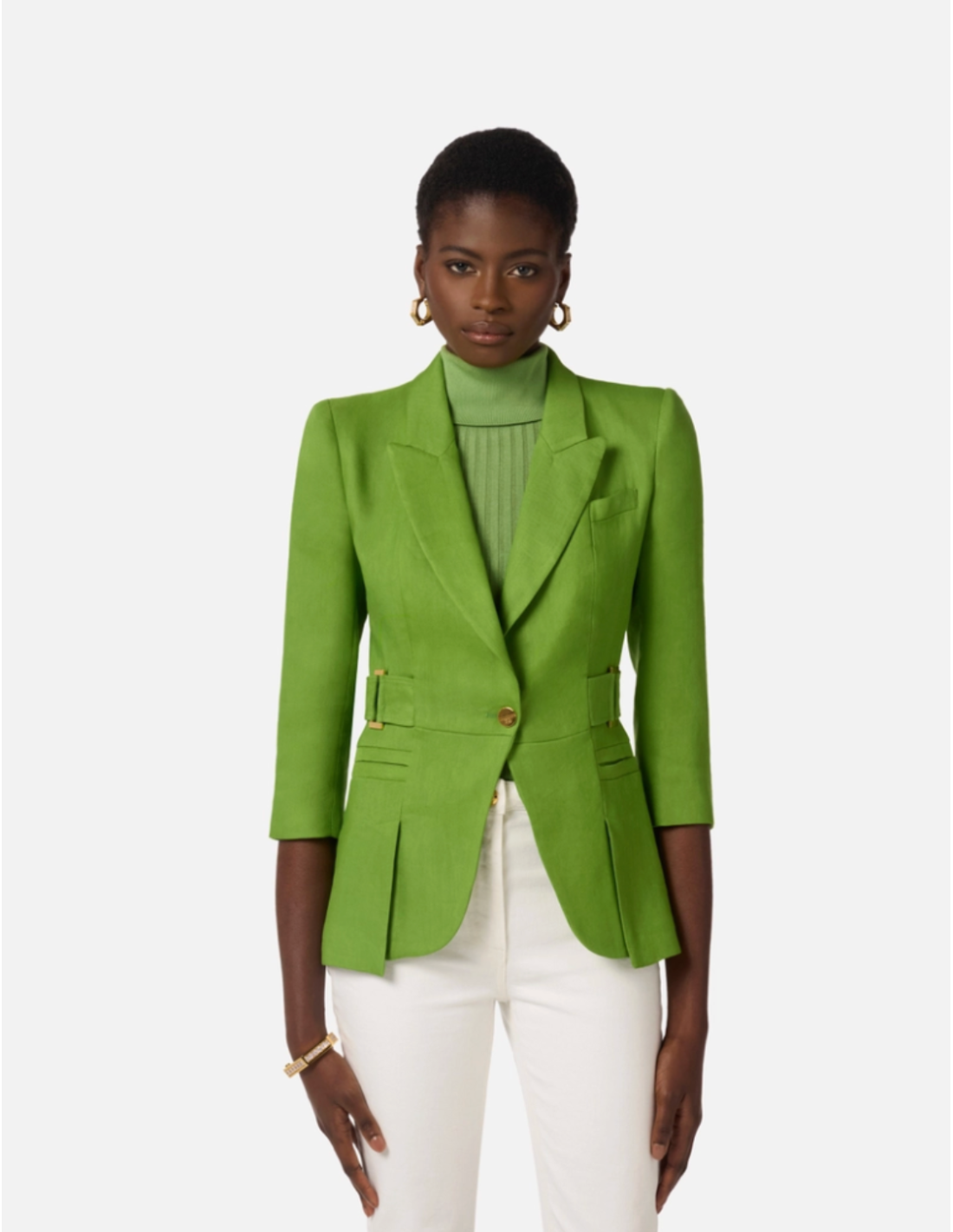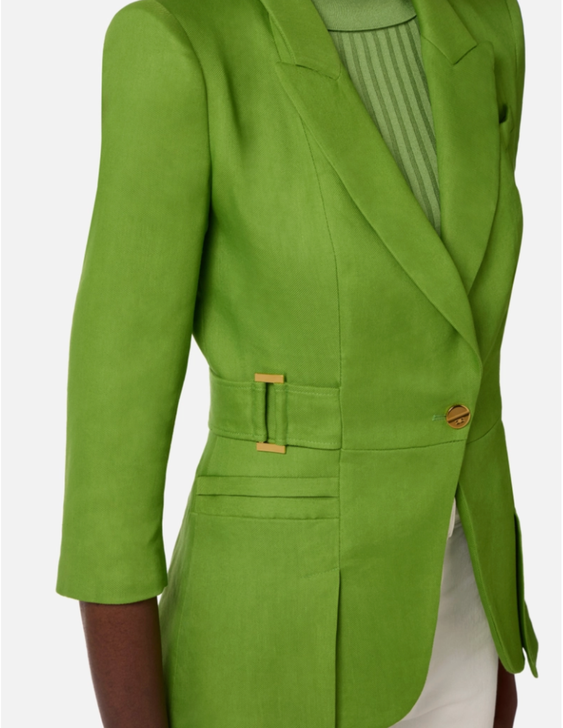 Cette veste en lin mélangé aloe incarne une élégance lumineuse parfaitement adaptée aux saisons chaudes. Confectionnée dans un lin mélangé léger, elle offre une sensation de fraîcheur tout en conservant une tenue structurée qui sublime la silhouette.