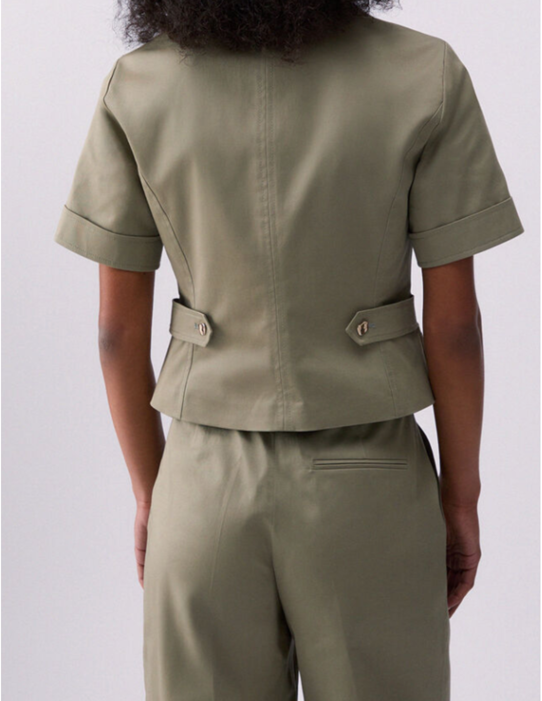 Ce blazer en gabardine vert combine élégance contemporaine et confort grâce à sa matière en gabardine extensible. Les revers classiques et les manches courtes lui donnent une allure structurée idéale pour des looks modernes et raffinés.